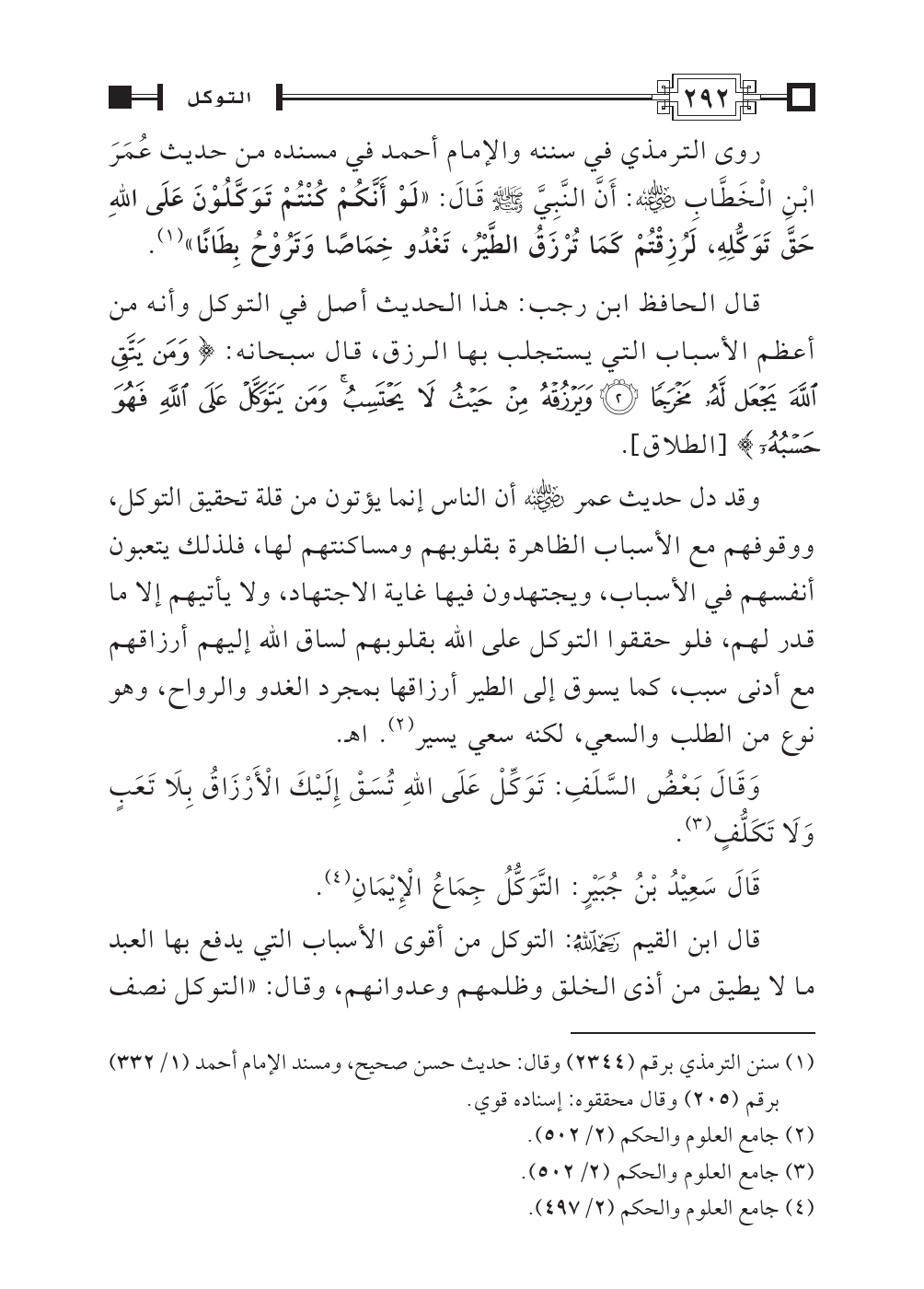 روى الترمذي في سننه والإمام أحمد في مسنده من حديث عُمَرَ ابْنِ الْخَطَّابِ - رضي الله عنه -: أَنَّ النَّبِيَّ - صلى الله عليه وسلم - قَالَ: «لَوْ أَنَّكُمْ كُنْتُمْ تَوَكَّلُوْنَ عَلَى اللهِ حَقَّ تَوَكُّلِهِ، لَرُزِقْتُمْ كَمَا تُرْزَقُ الطَّيْرُ، تَغْدُو خِمَاصًا وَتَرُوْحُ بِطَانًا» (¬١).