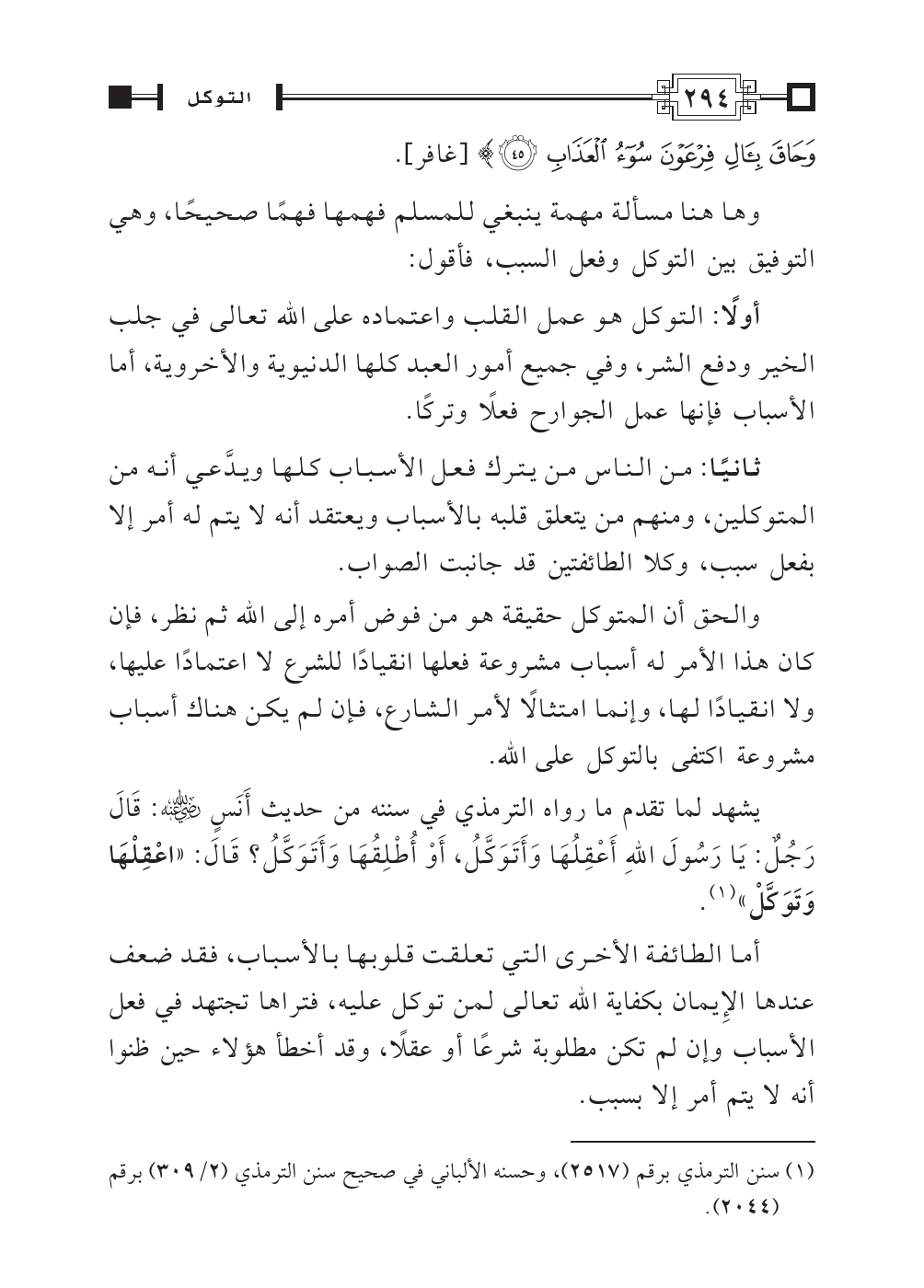 يشهد لما تقدم ما رواه الترمذي في سننه من حديث أَنَسٍ - رضي الله عنه -: قَالَ رَجُلٌ: يَا رَسُولَ اللهِ أَعْقِلُهَا وَأَتَوَكَّلُ، أَوْ أُطْلِقُهَا وَأَتَوَكَّلُ؟ قَالَ: «اعْقِلْهَا وَتَوَكَّلْ» (¬١).