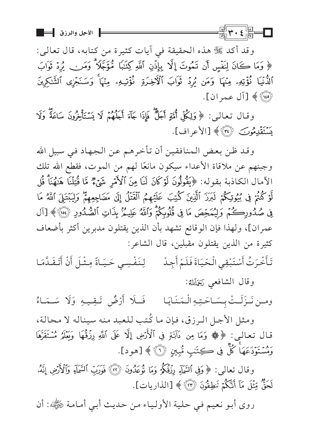 وقال تعالى: {وَلِكُلِّ أُمَّةٍ أَجَلٌ فَإِذَا جَاءَ أَجَلُهُمْ لَا يَسْتَاخِرُونَ سَاعَةً وَلَا يَسْتَقْدِمُونَ} [الأعراف: ٣٤].