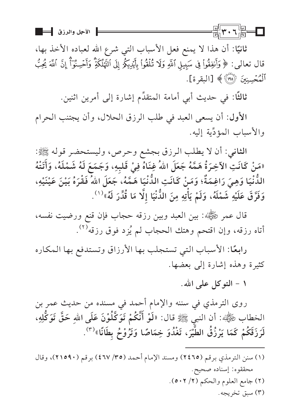 روى الترمذي في سننه والإمام أحمد في مسنده من حديث عمر بن الخطاب - رضي الله عنه -: أن النبي - صلى الله عليه وسلم - قال: «لَوْ أَنَّكُمْ تَوَكَّلُوْنَ عَلَى اللهِ حَقَّ تَوَكُّلِهِ، لَرَزَقَكُمْ كَمَا يَرْزُقُ الطَّيْرَ، تَغْدُوَ خِمَاصًا وَتَرُوْحُ بِطَانًا» (¬٣).