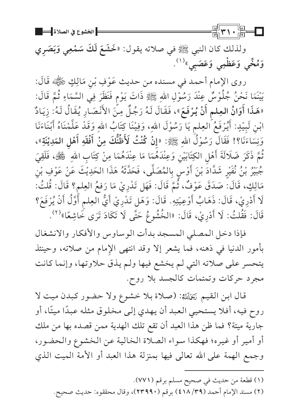 روى الإمام أحمد في مسنده من حديث عَوْفِ بْنِ مَالِكٍ - رضي الله عنه - قَالَ: بَيْنَمَا نَحْنُ جُلُوْسٌ عِنْدَ رَسُوْلِ اللهِ - صلى الله عليه وسلم - ذَاتَ يَوْمٍ فَنَظَرَ فِي السَّمَاءِ ثُمَّ قَالَ: «هَذَا أَوَانُ العِلمِ أَنْ يُرْفَعَ»، فَقَالَ لَهُ رَجُلٌ مِنَ الأَنْصَارِ يُقَالُ لَهُ: زِيَادٌ ابْنِ لَبِيْدٍ: أَيُرْفَعُ العِلمِ يَا رَسُوْلَ اللهِ، وَفِيْنَا كِتَابُ اللهِ وَقَدْ عَلَّمْنَاهُ أَبْنَاءَنَا وَنِسَاءَنَا؟ ! فَقَالَ رَسُوْلُ اللهِ - صلى الله عليه وسلم -: «إِنْ كُنْتُ لأَظُنُّكَ مِنْ أَفْقَهِ أَهْلِ المَدِيْنَةِ»، ثُمَّ ذَكَرَ ضَلالَةَ أَهْلِ الكِتَابَيْنِ وَعِنْدَهُمَا مَا عِنْدَهُمَا مِنْ كِتَابِ اللهِ عز وجل، فَلَقِيَ جُبَيْرُ بْنُ نُفَيْرٍ شَدَّادَ بْنَ أَوْسٍ بِالمُصَلَّى، فَحَدَّثَهُ هَذَا الحَدِيْثَ عَنْ عَوْفِ بْنِ مَالِكٍ، قَالَ: صَدَقَ عَوْفٌ، ثُمَّ قَالَ: فَهَل تَدْرِيْ مَا رَفعُ العِلمِ؟ قَالَ: قُلتُ: لَا أَدْرِيْ، قَالَ: ذَهَابُ أَوْعِيَتِهِ. قَالَ: وَهَل تَدْرِيْ أَيُّ العِلمِ أَوَّلُ أَنْ يُرْفَعَ؟ قَالَ: فَقُلتُ: لَا أَدْرِيْ، قَالَ: «الخُشُوعُ حَتَّى لَا تَكَادَ تَرَى خَاشِعًا» (¬٢).