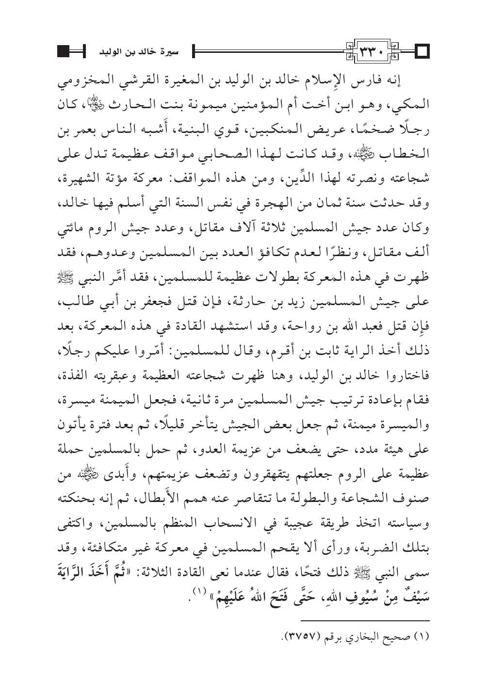 إنه فارس الإِسلام خالد بن الوليد بن المغيرة القرشي المخزومي المكي، وهو ابن أخت أم المؤمنين ميمونة بنت الحارث رضي الله عنها، كان رجلاً ضخمًا، عريض المنكبين، قوي البنية، أَشبه الناس بعمر بن الخطاب - رضي الله عنه -، وقد كانت لهذا الصحابي مواقف عظيمة تدل على شجاعته ونصرته لهذا الدِّين، ومن هذه المواقف: معركة مؤتة الشهيرة، وقد حدثت سنة ثمان من الهجرة في نفس السنة التي أسلم فيها خالد، وكان عدد جيش المسلمين ثلاثة آلاف مقاتل، وعدد جيش الروم مائتي ألف مقاتل، ونظرًا لعدم تكافؤ العدد بين المسلمين وعدوهم، فقد ظهرت في هذه المعركة بطولات عظيمة للمسلمين، فقد أمَّر النبي - صلى الله عليه وسلم - على جيش المسلمين زيد بن حارثة، فإن قتل فجعفر بن أبي طالب، فإِن قتل فعبد الله بن رواحة، وقد استشهد القادة في هذه المعركة، بعد ذلك أخذ الراية ثابت بن أقرم، وقال للمسلمين: أمّروا عليكم رجلاً، فاختاروا خالد بن الوليد، وهنا ظهرت شجاعته العظيمة وعبقريته الفذة، فقام بإعادة ترتيب جيش المسلمين مرة ثانية، فجعل الميمنة ميسرة، والميسرة ميمنة، ثم جعل بعض الجيش يتأخر قليلاً، ثم بعد فترة يأتون على هيئة مدد، حتى يضعف من عزيمة العدو، ثم حمل بالمسلمين حملة عظيمة على الروم جعلتهم يتقهقرون وتضعف عزيمتهم، وأَبدى - رضي الله عنه - من صنوف الشجاعة والبطولة ما تتقاصر عنه همم الأَبطال، ثم إنه بحنكته وسياسته اتخذ طريقة عجيبة في الانسحاب المنظم بالمسلمين، واكتفى بتلك الضربة، ورأى ألا يقحم المسلمين في معركة غير متكافئة، وقد سمى النبي - صلى الله عليه وسلم - ذلك فتحًا، فقال عندما نعى القادة الثلاثة: «ثُمَّ أَخَذَ الرَّايَةَ سَيْفٌ مِنْ سُيُوفِ اللهِ، حَتَّى فَتَحَ اللهُ عَلَيْهِمْ «(¬١).