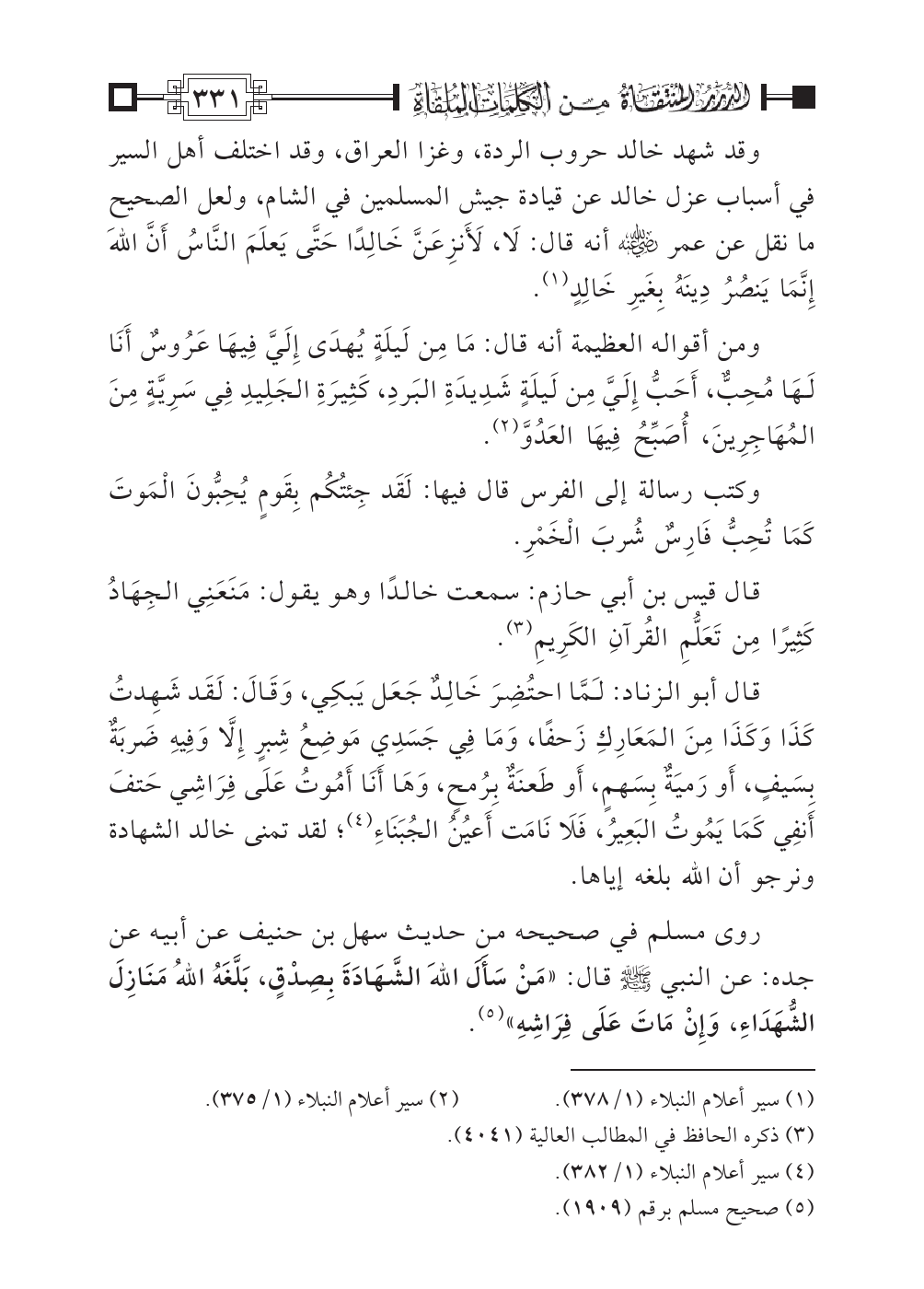 قال أبو الزناد: لَمَّا احتُضِرَ خَالِدٌ جَعَل يَبكِي، وَقَالَ: لَقَد شَهِدتُ كَذَا وَكَذَا مِنَ المَعَارِكِ زَحفًا، وَمَا فِي جَسَدِي مَوضِعُ شِبرٍ إِلَاّ وَفِيهِ ضَربَةٌ بِسَيفٍ، أَو رَميَةٌ بِسَهمٍ، أَو طَعنَةٌ بِرُمحٍ، وَهَا أَنَا أَمُوتُ عَلَى فِرَاشِي حَتفَ أَنفِي كَمَا يَمُوتُ البَعِيرُ، فَلَا نَامَت أَعيُنُ الجُبَنَاءِ (¬٤)؛ لقد تمنى خالد الشهادة ونرجو أن الله بلغه إياها.
