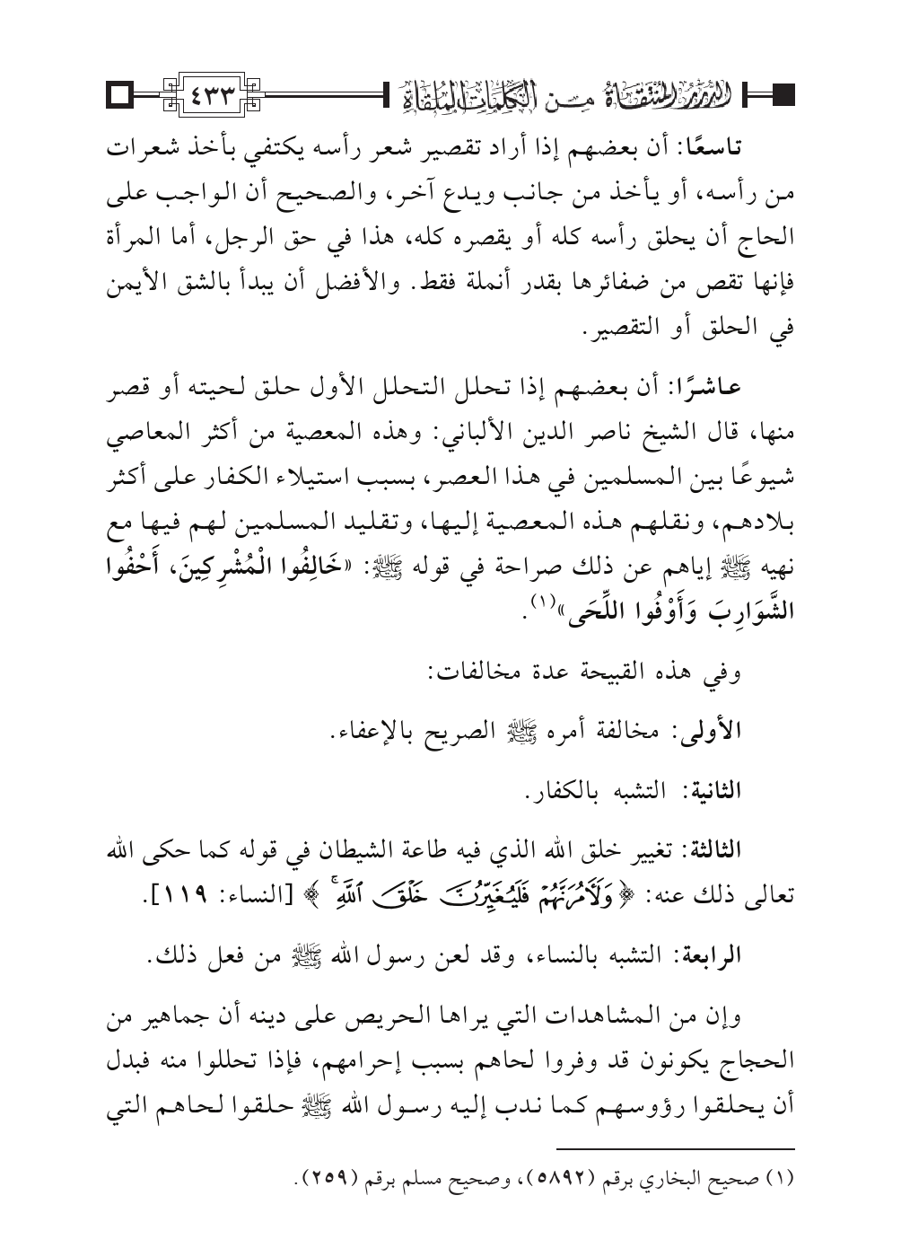 وإن من المشاهدات التي يراها الحريص على دينه أن جماهير من الحجاج يكونون قد وفروا لحاهم بسبب إحرامهم، فإذا تحللوا منه فبدل أن يحلقوا رؤوسهم كما ندب إليه رسول الله - صلى الله عليه وسلم - حلقوا لحاهم التي
