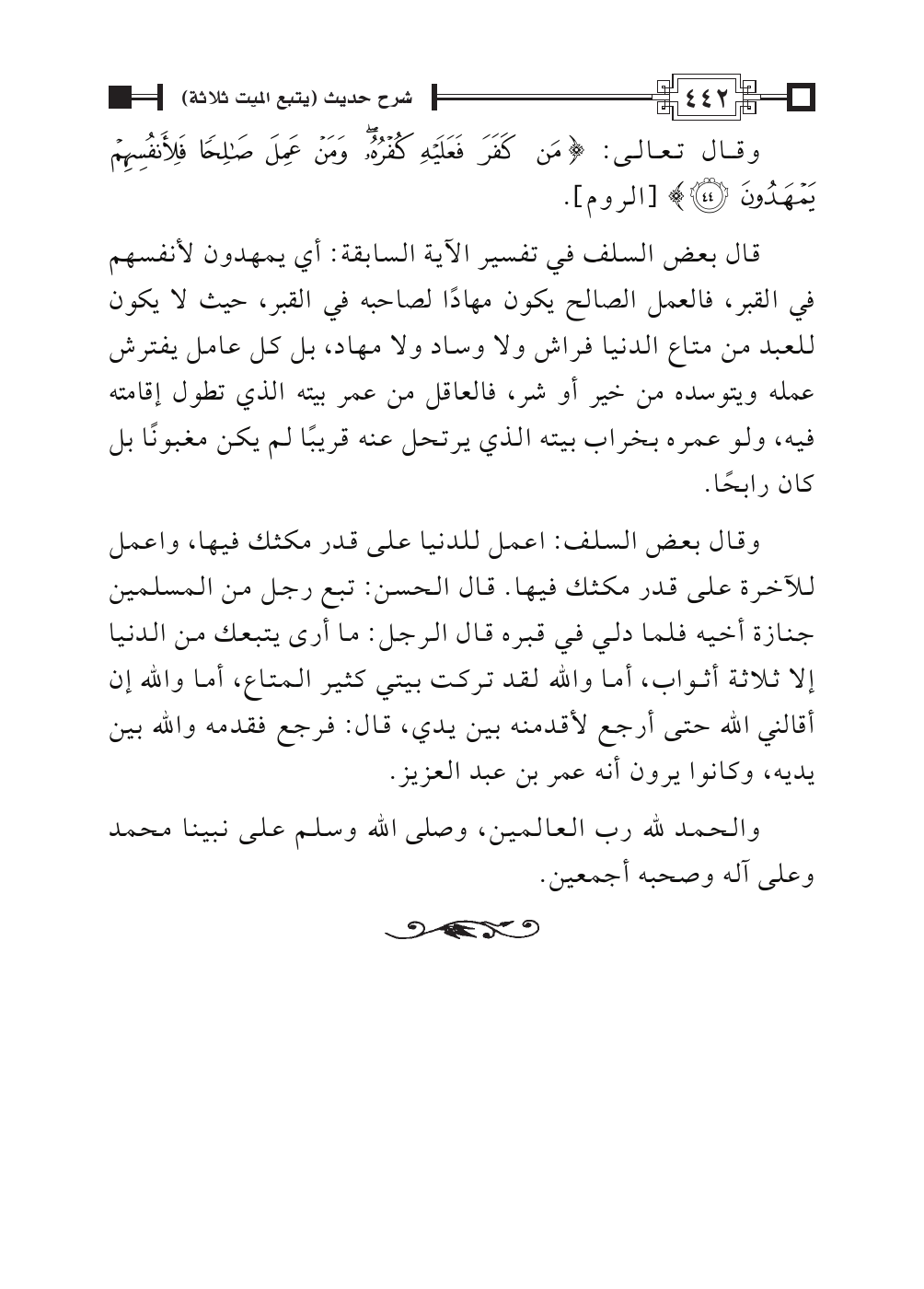 قال بعض السلف في تفسير الآية السابقة: أي يمهدون لأنفسهم في القبر، فالعمل الصالح يكون مهادًا لصاحبه في القبر، حيث لا يكون للعبد من متاع الدنيا فراش ولا وساد ولا مهاد، بل كل عامل يفترش عمله ويتوسده من خير أو شر، فالعاقل من عمر بيته الذي تطول إقامته فيه، ولو عمره بخراب بيته الذي يرتحل عنه قريبًا لم يكن مغبونًا بل كان رابحًا.