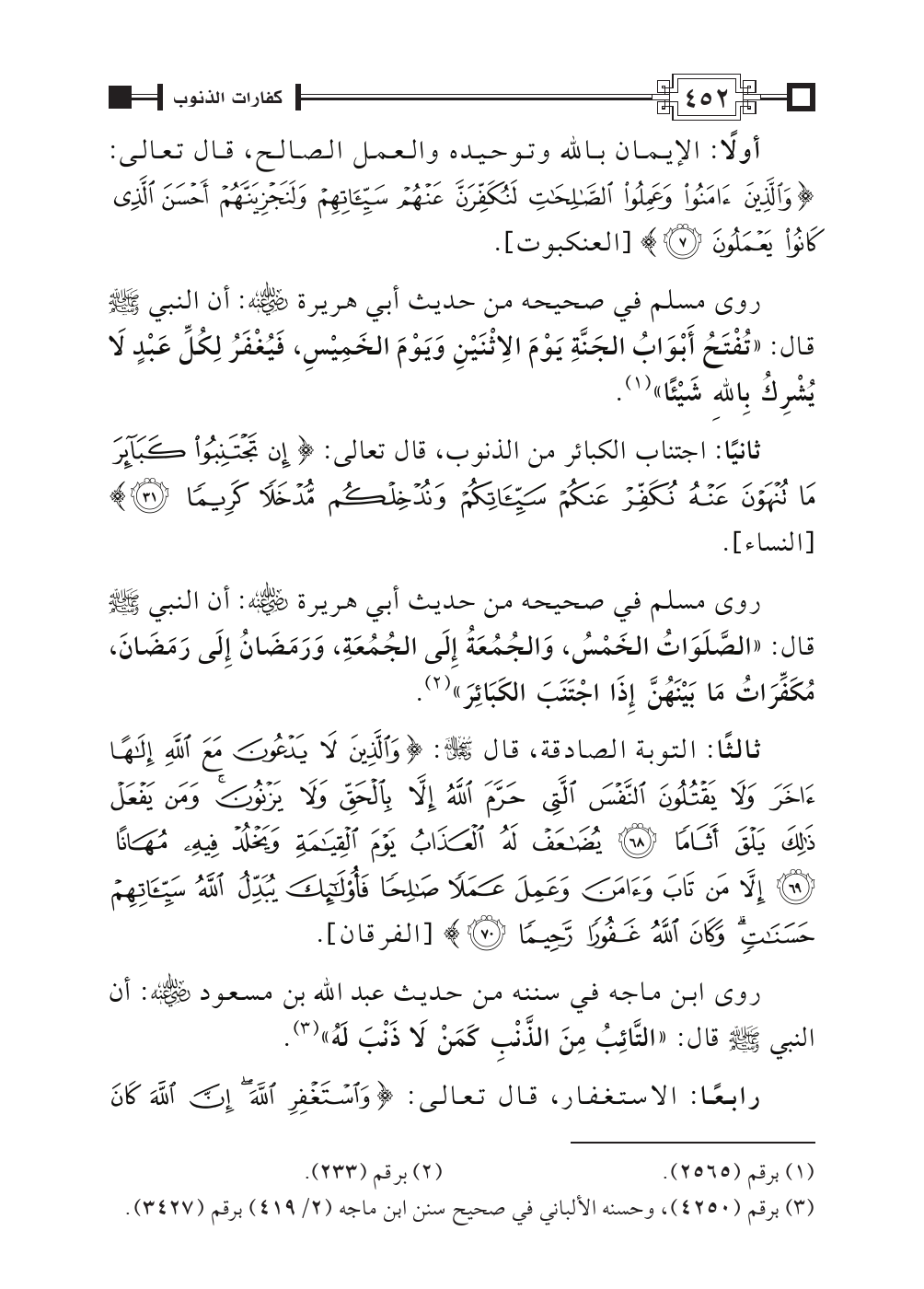 روى مسلم في صحيحه من حديث أبي هريرة - رضي الله عنه -: أن النبي - صلى الله عليه وسلم - قال: «الصَّلَوَاتُ الخَمْسُ، وَالجُمُعَةُ إِلَى الجُمُعَةِ، وَرَمَضَانُ إِلَى رَمَضَانَ، مُكَفِّرَاتُ مَا بَيْنَهُنَّ إِذَا اجْتَنَبَ الكَبَائِرَ» (¬٢).