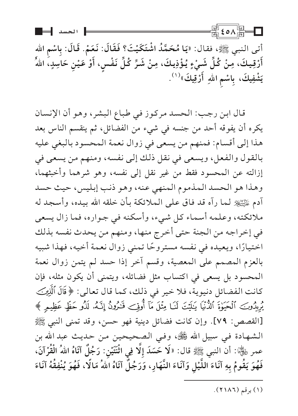 قال ابن رجب: الحسد مركوز في طباع البشر، وهو أن الإنسان يكره أن يفوقه أحد من جنسه في شيء من الفضائل، ثم ينقسم الناس بعد هذا إلى أقسام: فمنهم من يسعى في زوال نعمة المحسود بالبغي عليه بالقول والفعل، ويسعى في نقل ذلك إلى نفسه، ومنهم من يسعى في إزالته عن المحسود فقط من غير نقل إلى نفسه، وهو شرهما وأخبثهما، وهذا هو الحسد المذموم المنهي عنه، وهو ذنب إبليس، حيث حسد آدم عليه السلام لما رآه قد فاق على الملائكة بأن خلقه الله بيده، وأسجد له ملائكته، وعلمه أسماء كل شيء، وأسكنه في جواره، فما زال يسعى في إخراجه من الجنة حتى أخرج منها، ومنهم من يحدث نفسه بذلك اختيارًا، ويعيده في نفسه مستروحًا تمني زوال نعمة أخيه، فهذا شبيه بالعزم المصمم على المعصية، وقسم آخر إذا حسد لم يتمن زوال نعمة المحسود بل يسعى في اكتساب مثل فضائله، ويتمنى أن يكون مثله، فإن كانت الفضائل دنيوية، فلا خير في ذلك، كما قال تعالى: {قَالَ الَّذِينَ يُرِيدُونَ الحَيَاةَ الدُّنْيَا يَا لَيْتَ لَنَا مِثْلَ مَا أُوتِيَ قَارُونُ إِنَّهُ لَذُو حَظٍّ عَظِيمٍ} [القصص: ٧٩]. وإن كانت فضائل دينية فهو حسن، وقد تمنى النبي - صلى الله عليه وسلم - الشهادة في سبيل الله عز وجل، وفي الصحيحين من حديث عبد الله بن عمر رضي الله عنهما: أن النبي - صلى الله عليه وسلم - قال: «لَا حَسَدَ إِلَاّ فِي اثْنَتَيْنِ: رَجُلٌ آتَاهُ اللهُ الْقُرْآنَ، فَهُوَ يَقُومُ بِهِ آنَاءَ اللَّيْلِ وَآنَاءَ النَّهَارِ، وَرَجُلٌ آتَاهُ اللهُ مَالاً، فَهُوَ يُنْفِقُهُ آنَاءَ