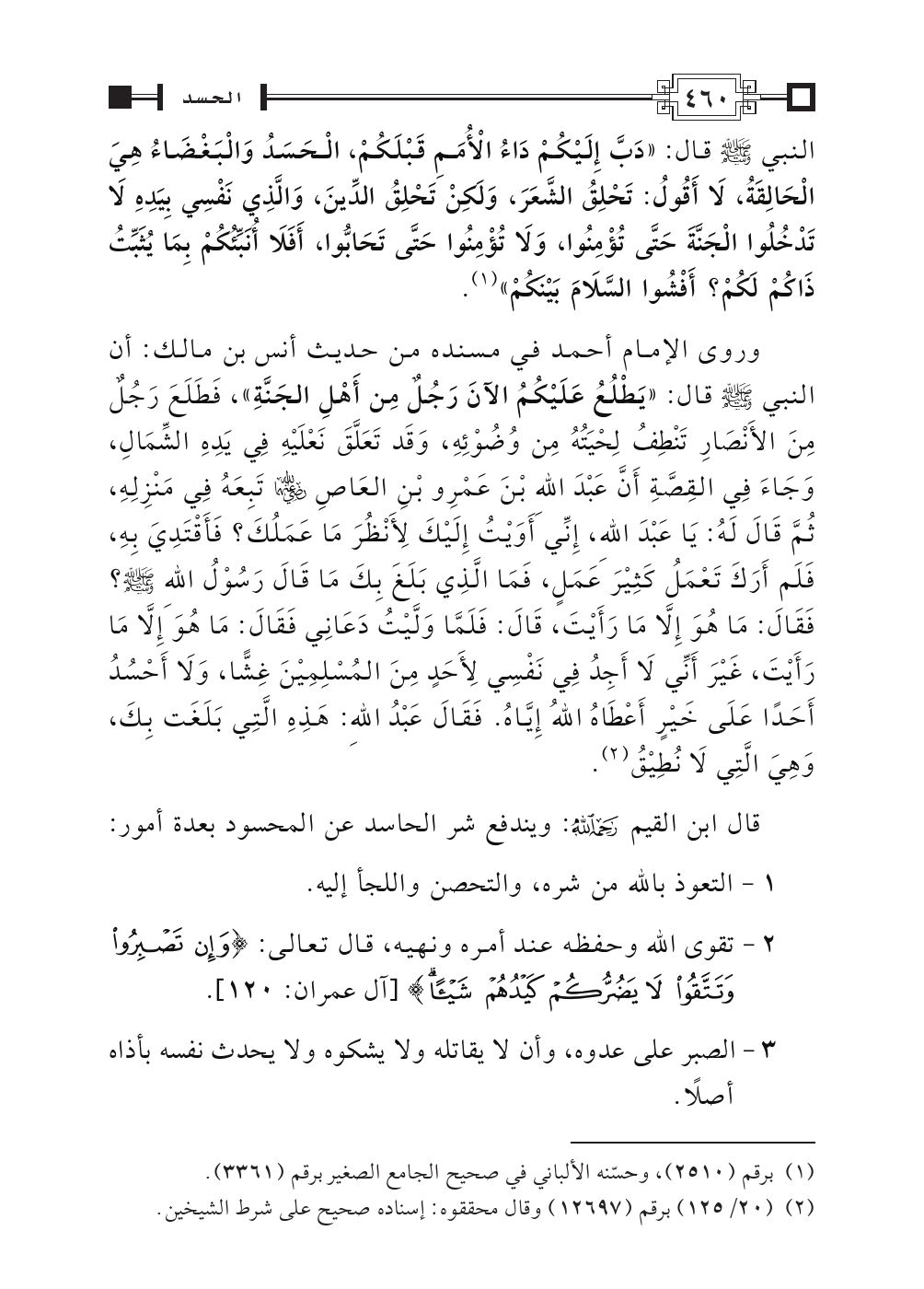 وروى الإمام أحمد في مسنده من حديث أنس بن مالك: أن النبي - صلى الله عليه وسلم - قال: «يَطْلُعُ عَلَيْكُمُ الآنَ رَجُلٌ مِن أَهْلِ الجَنَّةِ»، فَطَلَعَ رَجُلٌ مِنَ الأَنْصَارِ تَنْطِفُ لِحْيَتُهُ مِن وُضُوْئِهِ، وَقَد تَعَلَّقَ نَعْلَيْهِ فِي يَدِهِ الشِّمَالِ، وَجَاءَ فِي القِصَّةِ أَنَّ عَبْدَ اللهِ بْنَ عَمْرِو بْنِ العَاصِ رضي الله عنهما تَبِعَهُ فِي مَنْزِلِهِ، ثُمَّ قَالَ لَهُ: يَا عَبْدَ اللهِ، إِنِّي أَوَيْتُ إِلَيْكَ لأَنْظُرَ مَا عَمَلُكَ؟ فَأَقْتَدِيَ بِهِ، فَلَم أَرَكَ تَعْمَلُ كَثِيْرَ عَمَلٍ، فَمَا الَّذِي بَلَغَ بِكَ مَا قَالَ رَسُوْلُ اللهِ - صلى الله عليه وسلم -؟ فَقَالَ: مَا هُوَ إِلَاّ مَا رَأَيْتَ، قَالَ: فَلَمَّا وَلَّيْتُ دَعَانِي فَقَالَ: مَا هُوَ إِلَاّ مَا رَأَيْتَ، غَيْرَ أَنِّي لَا أَجِدُ فِي نَفْسِي لأَحَدٍ مِنَ المُسْلِمِيْنَ غِشًّا، وَلَا أَحْسُدُ أَحَدًا عَلَى خَيْرٍ أَعْطَاهُ اللهُ إِيَّاهُ. فَقَالَ عَبْدُ اللهِ: هَذِهِ الَّتِي بَلَغَت بِكَ، وَهِيَ الَّتِي لَا نُطِيْقُ (¬٢).