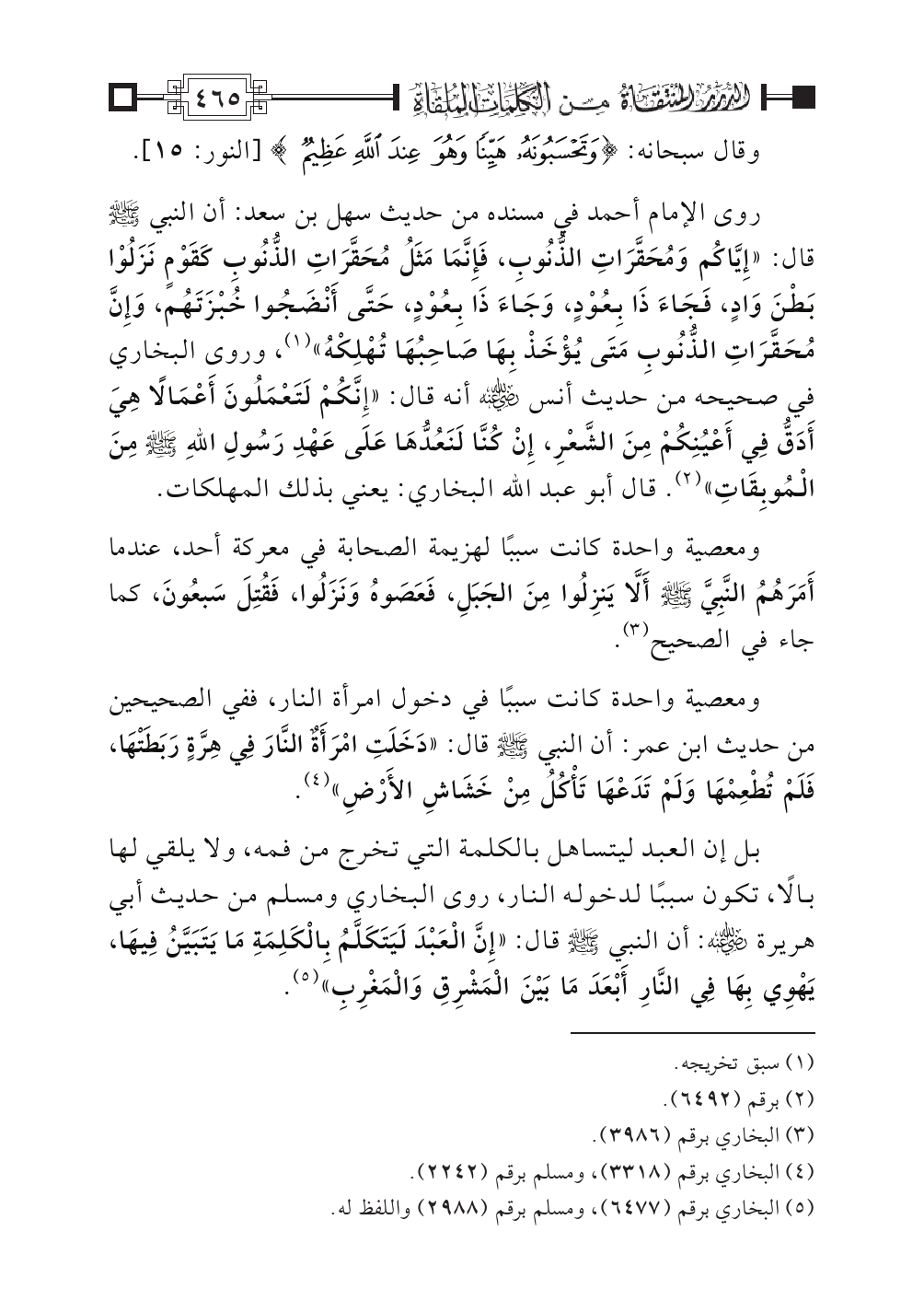 روى الإمام أحمد في مسنده من حديث سهل بن سعد: أن النبي - صلى الله عليه وسلم - قال: «إِيَّاكُم وَمُحَقَّرَاتِ الذُّنُوبِ، فَإِنَّمَا مَثَلُ مُحَقَّرَاتِ الذُّنُوبِ كَقَوْمٍ نَزَلُوْا بَطْنَ وَادٍ، فَجَاءَ ذَا بِعُوْدٍ، وَجَاءَ ذَا بِعُوْدٍ، حَتَّى أَنْضَجُوا خُبْزَتَهُم، وَإِنَّ مُحَقَّرَاتِ الذُّنُوبِ مَتَى يُؤْخَذْ بِهَا صَاحِبُهَا تُهْلِكْهُ» (¬١)، وروى البخاري في صحيحه من حديث أنس - رضي الله عنه - أنه قال: «إِنَّكُمْ لَتَعْمَلُونَ أَعْمَالاً هِيَ أَدَقُّ فِي أَعْيُنِكُمْ مِنَ الشَّعْرِ، إِنْ كُنَّا لَنَعُدُّهَا عَلَى عَهْدِ رَسُولِ اللهِ - صلى الله عليه وسلم - مِنَ الْمُوبِقَاتِ» (¬٢). قال أبو عبد الله البخاري: يعني بذلك المهلكات.