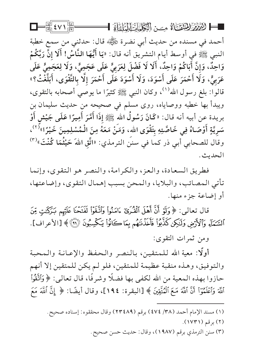 أحمد في مسنده من حديث أبي نضرة - رضي الله عنه - قال: حدثني من سمع خطبة النبي - صلى الله عليه وسلم - في أوسط أيام التشريق أنه قال: «يَا أَيُّهَا النَّاسُ! أَلَا إِنَّ رَبَّكُمْ وَاحِدٌ، وَإِنَّ أَبَاكُمْ وَاحِدٌ، أَلَا لَا فَضْلَ لِعَرَبِيٍّ عَلَى عَجَمِيٍّ، وَلَا لِعَجَمِيٍّ عَلَى عَرَبِيٍّ، وَلَا أَحْمَرَ عَلَى أَسْوَدَ، وَلَا أَسْوَدَ عَلَى أَحْمَرَ إِلَاّ بِالتَّقْوَى، أَبَلَّغْتُ؟ » قالوا: بلغ رسول الله (¬١)، وكان النبي - صلى الله عليه وسلم - كثيرًا ما يوصي أصحابه بالتقوى، ويبدأ بها خطبه ووصاياه، روى مسلم في صحيحه من حديث سليمان بن بريدة عن أبيه أنه قال: «كَانَ رَسُولُ اللهِ - صلى الله عليه وسلم - إِذَا أَمَّرَ أَمِيرًا عَلَى جَيْشٍ أَوْ سَرِيَّةٍ أَوْصَاهُ فِي خَاصَّتِهِ بِتَقْوَى اللهِ، وَمَنْ مَعَهُ مِنَ الْمُسْلِمِينَ خَيْرًا» (¬٢)، وقال للصحابي أبي ذر كما في سنن الترمذي: «اتَّقِ اللهَ حَيْثُمَا كُنْتَ» (¬٣) الحديث.