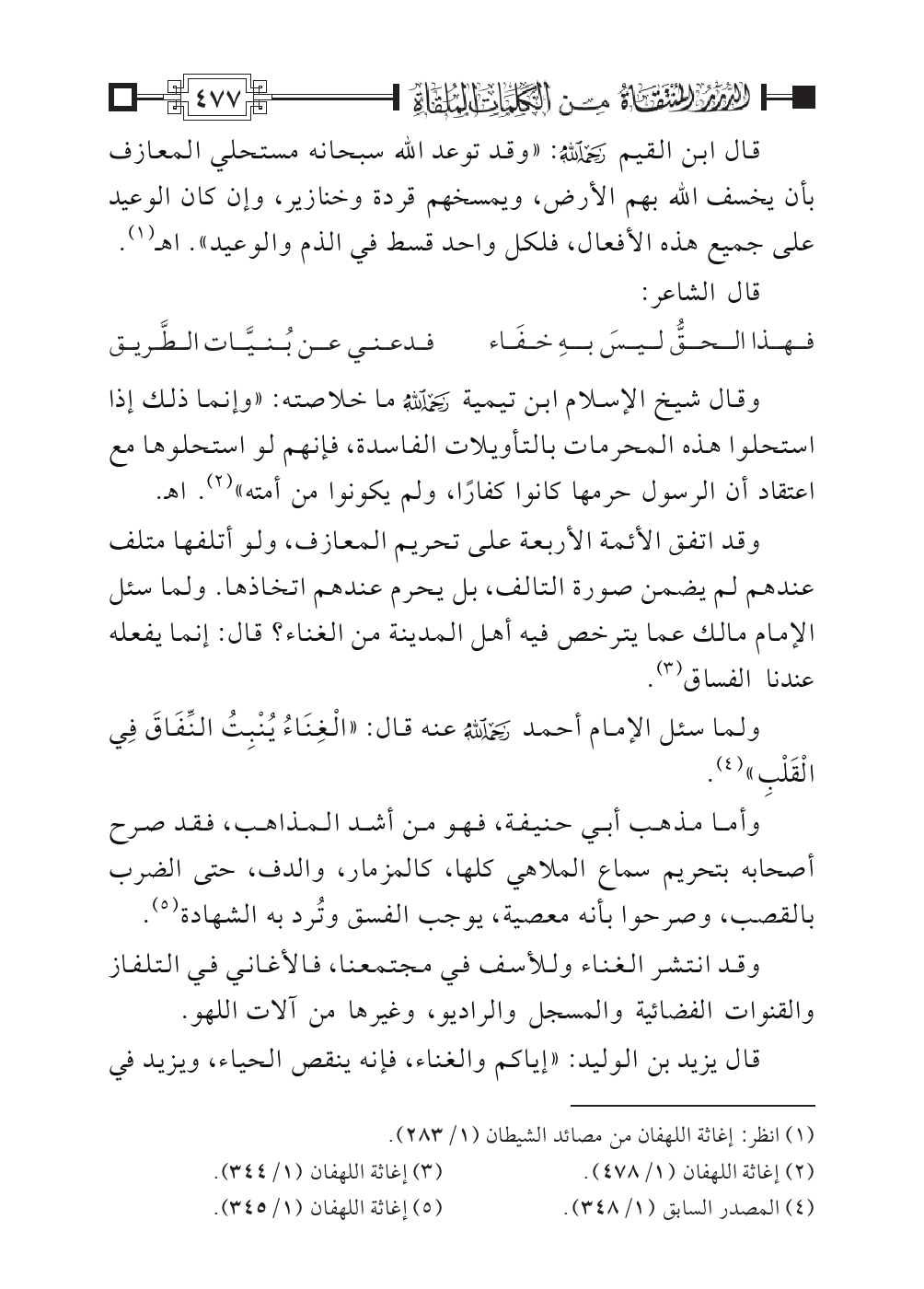 قال ابن القيم رحمه الله: «وقد توعد الله سبحانه مستحلي المعازف بأن يخسف الله بهم الأرض، ويمسخهم قردة وخنازير، وإن كان الوعيد على جميع هذه الأفعال، فلكل واحد قسط في الذم والوعيد». اهـ (¬١).