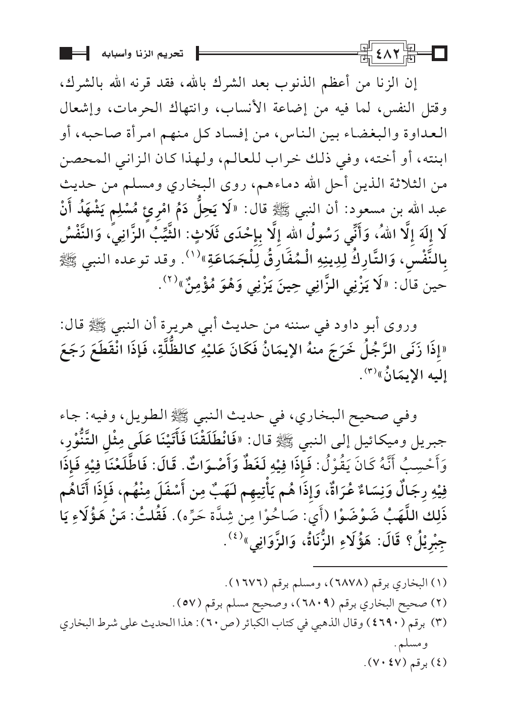 إن الزنا من أعظم الذنوب بعد الشرك بالله، فقد قرنه الله بالشرك، وقتل النفس، لما فيه من إضاعة الأنساب، وانتهاك الحرمات، وإشعال العداوة والبغضاء بين الناس، من إفساد كل منهم امرأة صاحبه، أو ابنته، أو أخته، وفي ذلك خراب للعالم، ولهذا كان الزاني المحصن من الثلاثة الذين أحل الله دماءهم، روى البخاري ومسلم من حديث عبد الله بن مسعود: أن النبي - صلى الله عليه وسلم - قال: «لَا يَحِلُّ دَمُ امْرِئٍ مُسْلِمٍ يَشْهَدُ أَنْ لَا إِلَهَ إِلَاّ اللهُ، وَأَنِّي رَسُولُ اللهِ إِلَاّ بِإِحْدَى ثَلَاثٍ: الثَّيِّبُ الزَّانِي، وَالنَّفْسُ بِالنَّفْسِ، وَالتَّارِكُ لِدِينِهِ الْمُفَارِقُ لِلْجَمَاعَةِ» (¬١). وقد توعده النبي - صلى الله عليه وسلم - حين قال: «لَا يَزْنِي الزَّانِي حِينَ يَزْنِي وَهْوَ مُؤْمِنٌ» (¬٢).