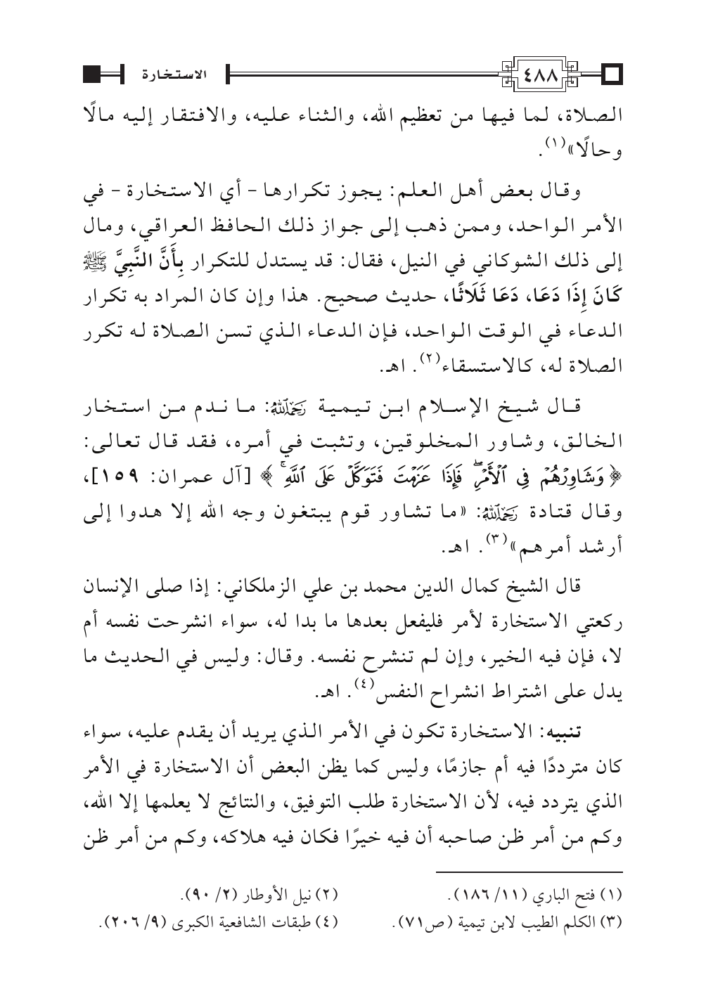وقال بعض أهل العلم: يجوز تكرارها - أي الاستخارة - في الأمر الواحد، وممن ذهب إلى جواز ذلك الحافظ العراقي، ومال إلى ذلك الشوكاني في النيل، فقال: قد يستدل للتكرار بِأَنَّ النَّبِيَّ - صلى الله عليه وسلم - كَانَ إِذَا دَعَا، دَعَا ثَلَاثًا، حديث صحيح. هذا وإن كان المراد به تكرار الدعاء في الوقت الواحد، فإن الدعاء الذي تسن الصلاة له تكرر الصلاة له، كالاستسقاء (¬٢). اهـ.