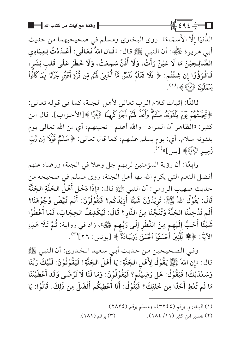 رابعًا: أن رؤية المؤمنين لربهم جل وعلا في الجنة، ورضاه عنهم أفضل النعم التي يكرم الله بها أهل الجنة، روى مسلم في صحيحه من حديث صهيب الرومي: أن النبي - صلى الله عليه وسلم - قال: «إِذَا دَخَل أَهْلُ الجَنَّةِ الجَنَّةَ قَالَ: يَقُوْلُ اللهُ تبارك وتعالى: تُرِيْدُوْنَ شَيْئًا أَزِيْدُكُم؟ فَيَقُوْلُوْنَ: أَلَم تُبَيِّضْ وُجُوْهَنَا؟ أَلَم تُدْخِلْنَا الجَنَّةَ وَتُنَجِّنَا مِنَ النَّارِ؟ قَالَ: فَيَكْشِفُ الحِجَابَ، فَمَا أُعْطُوْا شَيْئًا أَحَبَّ إِلَيْهِم مِنَ النَّظَرِ إِلَى رَبِّهِم عز وجل»، زاد في رواية: ثُمَّ تَلَا هَذِهِ الآيَةَ: {لِلَّذِينَ أَحْسَنُوا الحُسْنَى وَزِيَادَةٌ} [يونس: ٢٦] (¬٣).