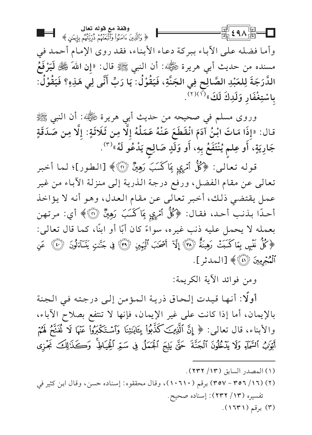 قوله تعالى: {كُلُّ امْرِئٍ بِمَا كَسَبَ رَهِينٌ} [الطور: ٢١]؛ لما أخبر تعالى عن مقام الفضل، ورفع درجة الذرية إلى منزلة الآباء من غير عمل يقتضي ذلك، أخبر تعالى عن مقام العدل، وهو أنه لا يؤاخذ أحدًا بذنب أحد، فقال: {كُلُّ امْرِئٍ بِمَا كَسَبَ رَهِينٌ} أي: مرتهن بعمله لا يحمل عليه ذنب غيره، سواءً كان أبًا أو ابنًا، كما قال تعالى: {كُلُّ نَفْسٍ بِمَا كَسَبَتْ رَهِينَةٌ * إِلَاّ أَصْحَابَ اليَمِينِ * فِي جَنَّاتٍ يَتَسَاءَلُونَ * عَنِ المُجْرِمِينَ} [المدثر: ٣٨ - ٤١].