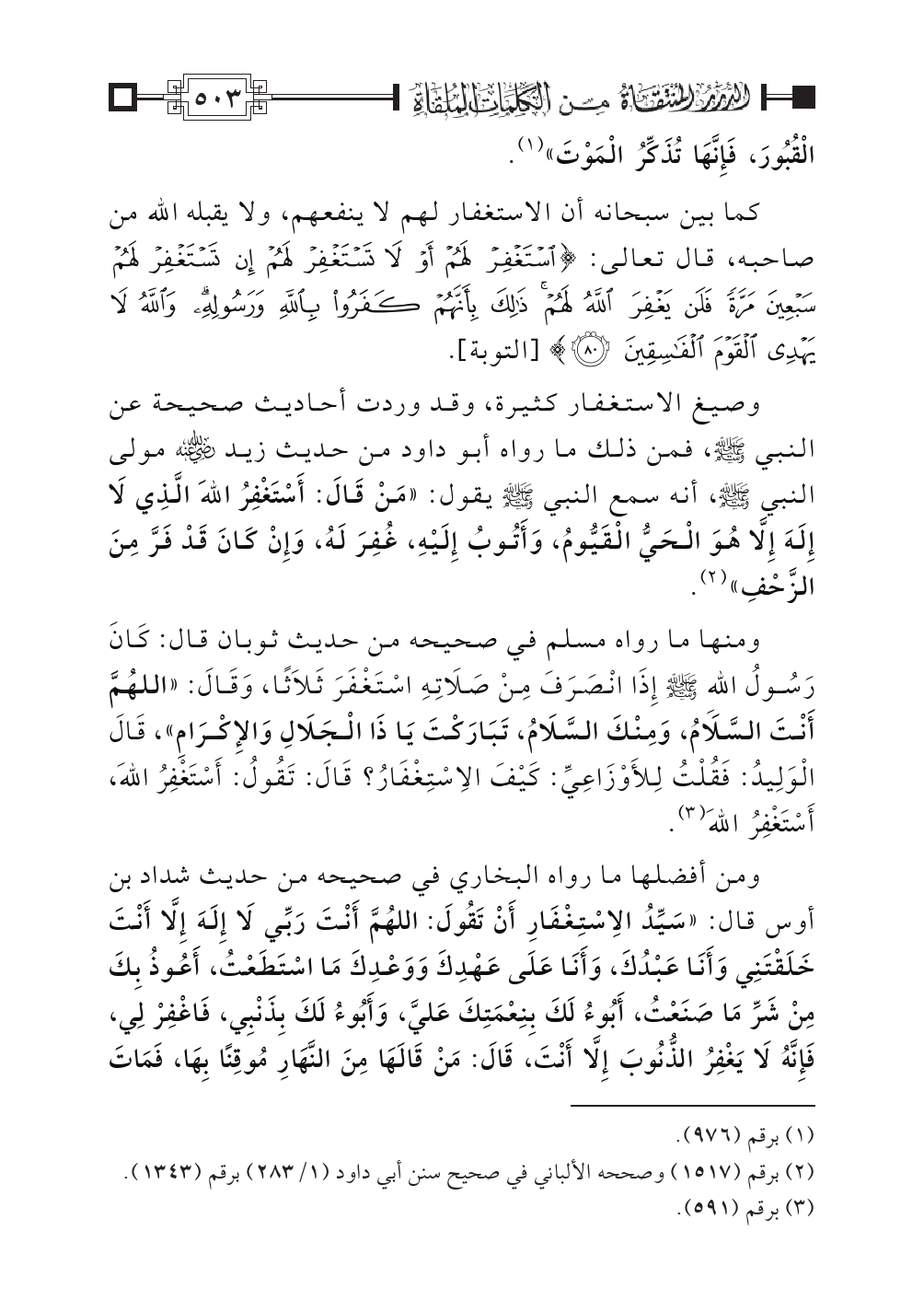 وصيغ الاستغفار كثيرة، وقد وردت أحاديث صحيحة عن النبي - صلى الله عليه وسلم -، فمن ذلك ما رواه أبو داود من حديث زيد - رضي الله عنه - مولى النبي - صلى الله عليه وسلم -، أنه سمع النبي - صلى الله عليه وسلم - يقول: «مَنْ قَالَ: أَسْتَغْفِرُ اللهَ الَّذِي لَا إِلَهَ إِلَاّ هُوَ الْحَيُّ الْقَيُّومُ، وَأَتُوبُ إِلَيْهِ، غُفِرَ لَهُ، وَإِنْ كَانَ قَدْ فَرَّ مِنَ الزَّحْفِ» (¬٢).