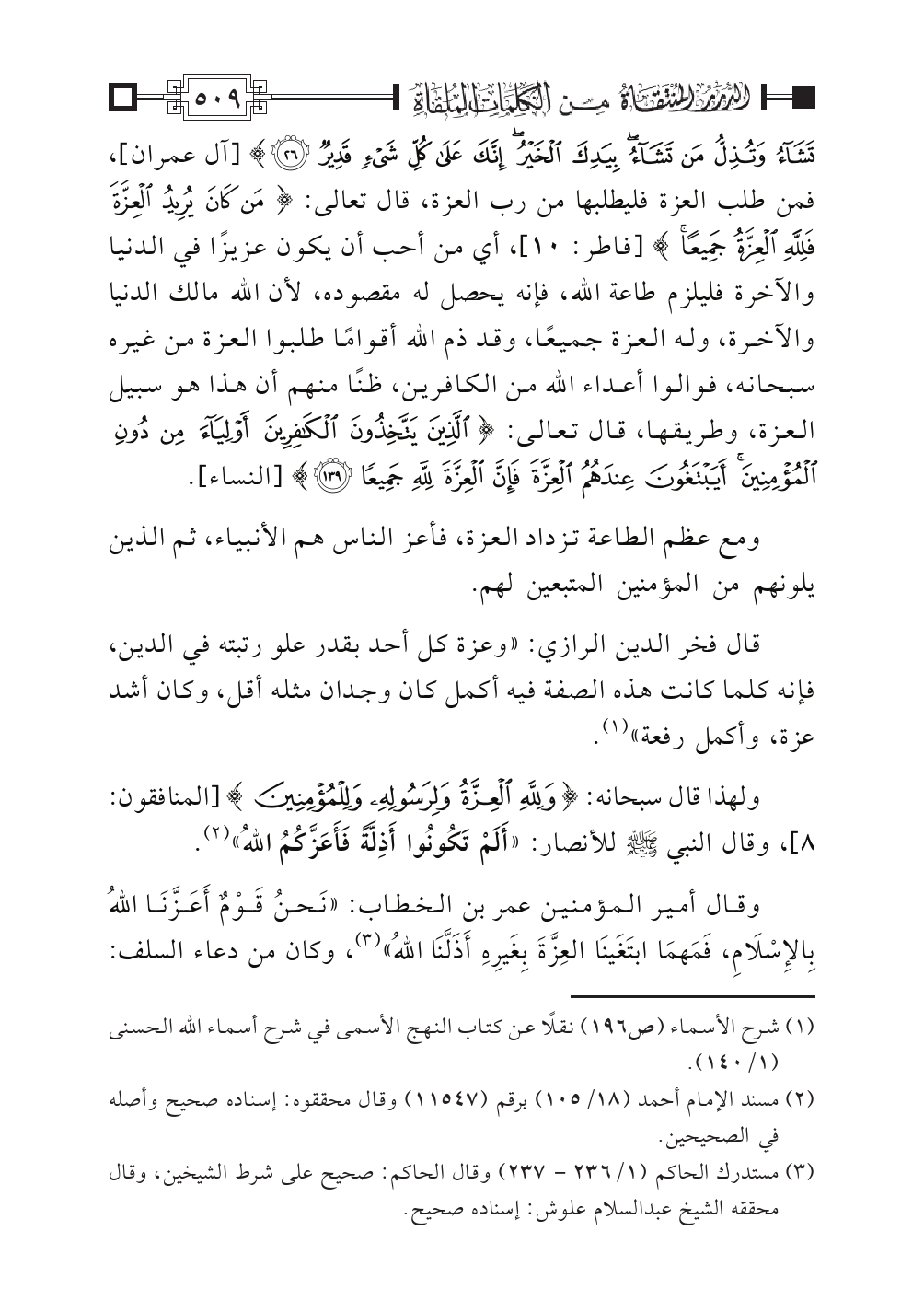 تَشَاءُ وَتُذِلُّ مَنْ تَشَاءُ بِيَدِكَ الخَيْرُ إِنَّكَ عَلَى كُلِّ شَيْءٍ قَدِيرٌ} [آل عمران: ٢٦]، فمن طلب العزة فليطلبها من رب العزة، قال تعالى: {مَنْ كَانَ يُرِيدُ العِزَّةَ فَللهِ العِزَّةُ جَمِيعًا} [فاطر: ١٠]، أي من أحب أن يكون عزيزًا في الدنيا والآخرة فليلزم طاعة الله، فإنه يحصل له مقصوده، لأن الله مالك الدنيا والآخرة، وله العزة جميعًا، وقد ذم الله أقوامًا طلبوا العزة من غيره سبحانه، فوالوا أعداء الله من الكافرين، ظنًا منهم أن هذا هو سبيل العزة، وطريقها، قال تعالى: {الَّذِينَ يَتَّخِذُونَ الكَافِرِينَ أَوْلِيَاءَ مِنْ دُونِ المُؤْمِنِينَ أَيَبْتَغُونَ عِنْدَهُمُ العِزَّةَ فَإِنَّ العِزَّةَ للهِ جَمِيعًا} [النساء: ١٣٩].