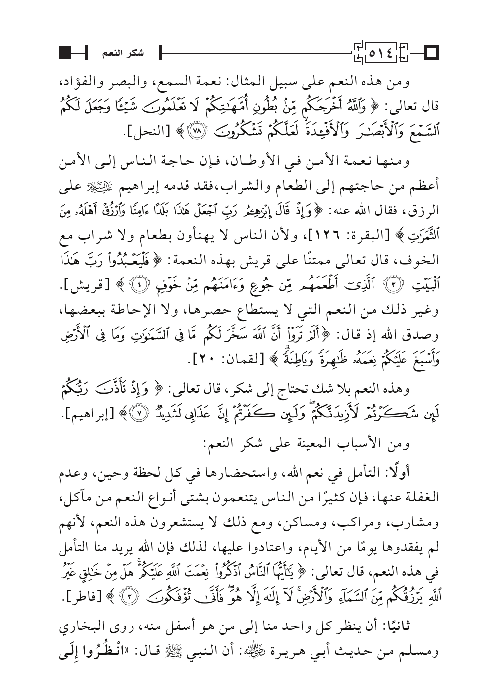 ومنها نعمة الأمن في الأوطان، فإن حاجة الناس إلى الأمن أعظم من حاجتهم إلى الطعام والشراب، فقد قدمه إبراهيم عليه السلام على الرزق، فقال الله عنه: {وَإِذْ قَالَ إِبْرَاهِيمُ رَبِّ اجْعَلْ هَذَا بَلَدًا آَمِنًا وَارْزُقْ أَهْلَهُ مِنَ الثَّمَرَاتِ} [البقرة: ١٢٦]، ولأن الناس لا يهنأون بطعام ولا شراب مع الخوف، قال تعالى ممتنًا على قريش بهذه النعمة: {فَلْيَعْبُدُوا رَبَّ هَذَا البَيْتِ * الَّذِي أَطْعَمَهُمْ مِنْ جُوعٍ وَآَمَنَهُمْ مِنْ خَوْفٍ} [قريش: ٣ - ٤]. وغير ذلك من النعم التي لا يستطاع حصرها، ولا الإحاطة ببعضها، وصدق الله إذ قال: {أَلَمْ تَرَوْا أَنَّ اللهَ سَخَّرَ لَكُمْ مَا فِي السَّمَاوَاتِ وَمَا فِي الأَرْضِ وَأَسْبَغَ عَلَيْكُمْ نِعَمَهُ ظَاهِرَةً وَبَاطِنَةً} [لقمان: ٢٠].