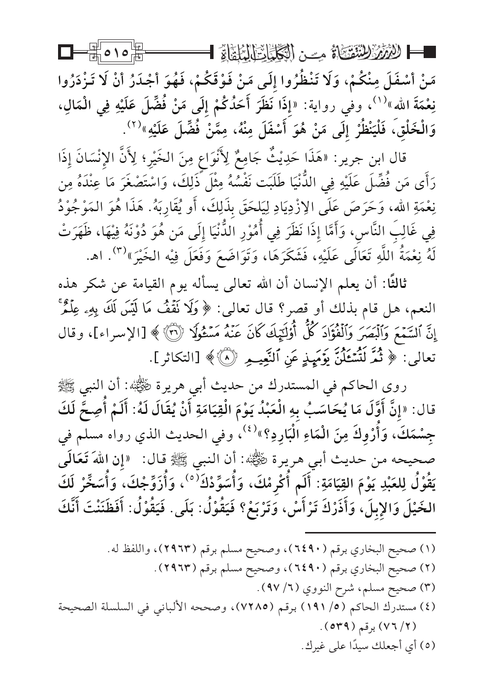 قال ابن جرير: «هَذَا حَدِيْثٌ جَامِعٌ لأَنْوَاعٍ مِنَ الخَيْرِ؛ لأَنَّ الإِنْسَانَ إِذَا رَأَى مَن فُضِّلَ عَلَيْهِ فِي الدُّنْيَا طَلَبَت نَفْسُهُ مِثْلَ ذَلِكَ، وَاسْتَصْغَرَ مَا عِنْدَهُ مِن نِعْمَةِ اللهِ، وَحَرَصَ عَلَى الازْدِيَادِ لِيَلحَقَ بِذَلِكَ، أَو يُقَارِبَهُ. هَذَا هُوَ المَوْجُوْدُ فِي غَالِبِ النَّاسِ، وَأَمَّا إِذَا نَظَرَ فِي أُمُوْرِ الدُّنْيَا إِلَى مَن هُوَ دُوْنَهُ فِيْهَا، ظَهَرَتْ لَهُ نِعْمَةُ اللَّهِ تَعَالَى عَلَيْهِ، فَشَكَرَهَا، وَتَوَاضَعَ وَفَعَلَ فِيْه الخَيْرَ» (¬٣). اهـ.