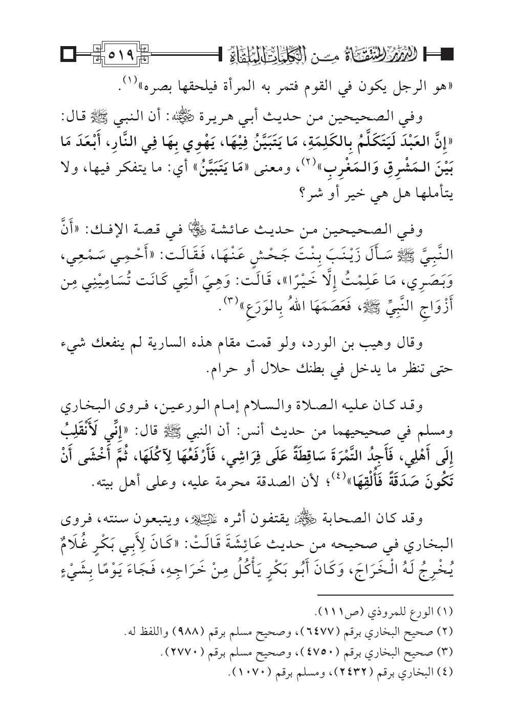 وقد كان عليه الصلاة والسلام إمام الورعين، فروى البخاري ومسلم في صحيحيهما من حديث أنس: أن النبي - صلى الله عليه وسلم - قال: «إِنِّي لأَنْقَلِبُ إِلَى أَهْلِي، فَأَجِدُ التَّمْرَةَ سَاقِطَةً عَلَى فِرَاشِي، فَأَرْفَعُهَا لآكُلَهَا، ثُمَّ أَخْشَى أَنْ تَكُونَ صَدَقَةً فَأُلْقِهَا» (¬٤)؛ لأن الصدقة محرمة عليه، وعلى أهل بيته.