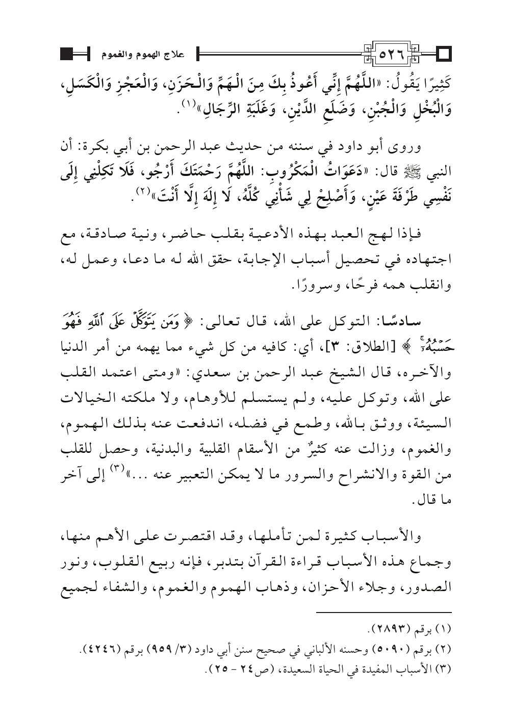 سادسًا: التوكل على الله، قال تعالى: {وَيَرْزُقْهُ مِنْ حَيْثُ لَا يَحْتَسِبُ وَمَنْ يَتَوَكَّلْ عَلَى اللهِ فَهُوَ حَسْبُهُ إِنَّ اللهَ بَالِغُ أَمْرِهِ قَدْ جَعَلَ اللهُ لِكُلِّ شَيْءٍ قَدْرًا} [الطلاق: ٣]، أي: كافيه من كل شيء مما يهمه من أمر الدنيا والآخره، قال الشيخ عبد الرحمن بن سعدي: «ومتى اعتمد القلب على الله، وتوكل عليه، ولم يستسلم للأوهام، ولا ملكته الخيالات السيئة، ووثق بالله، وطمع في فضله، اندفعت عنه بذلك الهموم، والغموم، وزالت عنه كثيرٌ من الأسقام القلبية والبدنية، وحصل للقلب من القوة والانشراح والسرور ما لا يمكن التعبير عنه ... » (¬٣) إلى آخر ما قال.