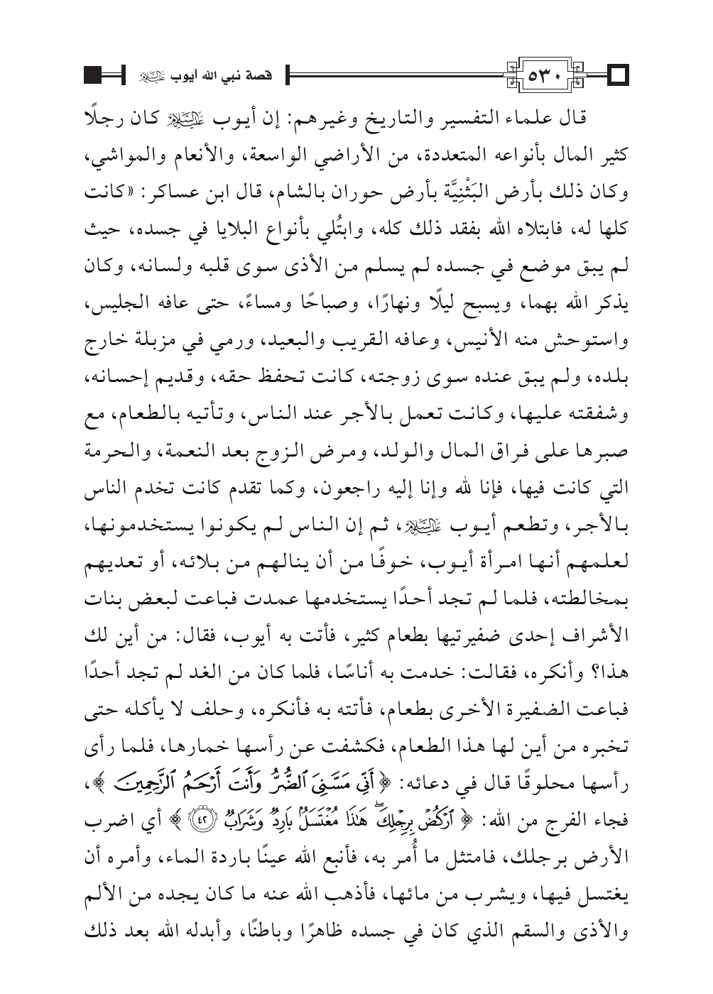 قال علماء التفسير والتاريخ وغيرهم: إن أيوب عليه السلام كان رجلاً كثير المال بأنواعه المتعددة، من الأراضي الواسعة، والأنعام والمواشي، وكان ذلك بأرض البَثْنِيَّة بأرض حوران بالشام، قال ابن عساكر: «كانت كلها له، فابتلاه الله بفقد ذلك كله، وابتُلي بأنواع البلايا في جسده، حيث لم يبق موضع في جسده لم يسلم من الأذى سوى قلبه ولسانه، وكان يذكر الله بهما، ويسبح ليلاً ونهارًا، وصباحًا ومساءً، حتى عافه الجليس، واستوحش منه الأنيس، وعافه القريب والبعيد، ورمي في مزبلة خارج بلده، ولم يبق عنده سوى زوجته، كانت تحفظ حقه، وقديم إحسانه، وشفقته عليها، وكانت تعمل بالأجر عند الناس، وتأتيه بالطعام، مع صبرها على فراق المال والولد، ومرض الزوج بعد النعمة، والحرمة التي كانت فيها، فإنا لله وإنا إليه راجعون، وكما تقدم كانت تخدم الناس بالأجر، وتطعم أيوب عليه السلام، ثم إن الناس لم يكونوا يستخدمونها، لعلمهم أنها امرأة أيوب، خوفًا من أن ينالهم من بلائه، أو تعديهم بمخالطته، فلما لم تجد أحدًا يستخدمها عمدت فباعت لبعض بنات الأشراف إحدى ضفيرتيها بطعام كثير، فأتت به أيوب، فقال: من أين لك هذا؟ وأنكره، فقالت: خدمت به أناسًا، فلما كان من الغد لم تجد أحدًا فباعت الضفيرة الأخرى بطعام، فأتته به فأنكره، وحلف لا يأكله حتى تخبره من أين لها هذا الطعام، فكشفت عن رأسها خمارها، فلما رأى رأسها محلوقًا قال في دعائه: {أَنِّي مَسَّنِيَ الضُّرُّ وَأَنْتَ أَرْحَمُ الرَّاحِمِينَ}، فجاء الفرج من الله: {ارْكُضْ بِرِجْلِكَ هَذَا مُغْتَسَلٌ بَارِدٌ وَشَرَابٌ} أي اضرب الأرض برجلك، فامتثل ما أُمر به، فأنبع الله عينًا باردة الماء، وأمره أن يغتسل فيها، ويشرب من مائها، فأذهب الله عنه ما كان يجده من الألم والأذى والسقم الذي كان في جسده ظاهرًا وباطنًا، وأبدله الله بعد ذلك