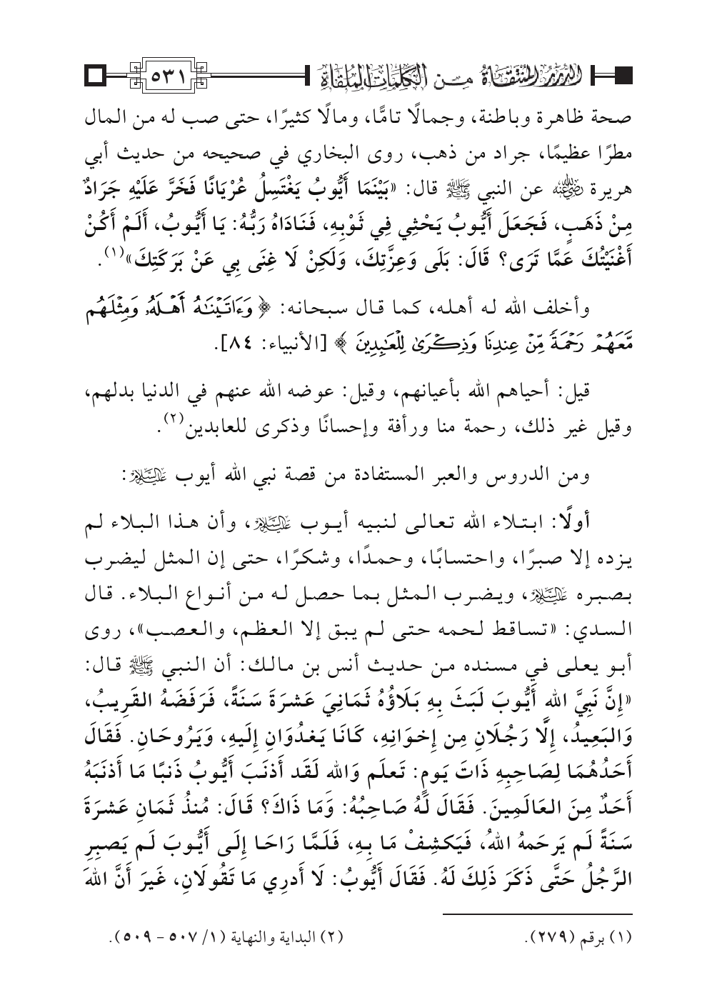 مطرًا عظيمًا، جراد من ذهب، روى البخاري في صحيحه من حديث أبي هريرة - رضي الله عنه - عن النبي - صلى الله عليه وسلم - قال: «بَيْنَمَا أَيُّوبُ يَغْتَسِلُ عُرْيَانًا فَخَرَّ عَلَيْهِ جَرَادٌ مِنْ ذَهَبٍ، فَجَعَلَ أَيُّوبُ يَحْثِي فِي ثَوْبِهِ، فَنَادَاهُ رَبُّهُ: يَا أَيُّوبُ، أَلَمْ أَكُنْ أَغْنَيْتُكَ عَمَّا تَرَى؟ قَالَ: بَلَى وَعِزَّتِكَ، وَلَكِنْ لَا غِنَى بِي عَنْ بَرَكَتِكَ» (¬١).