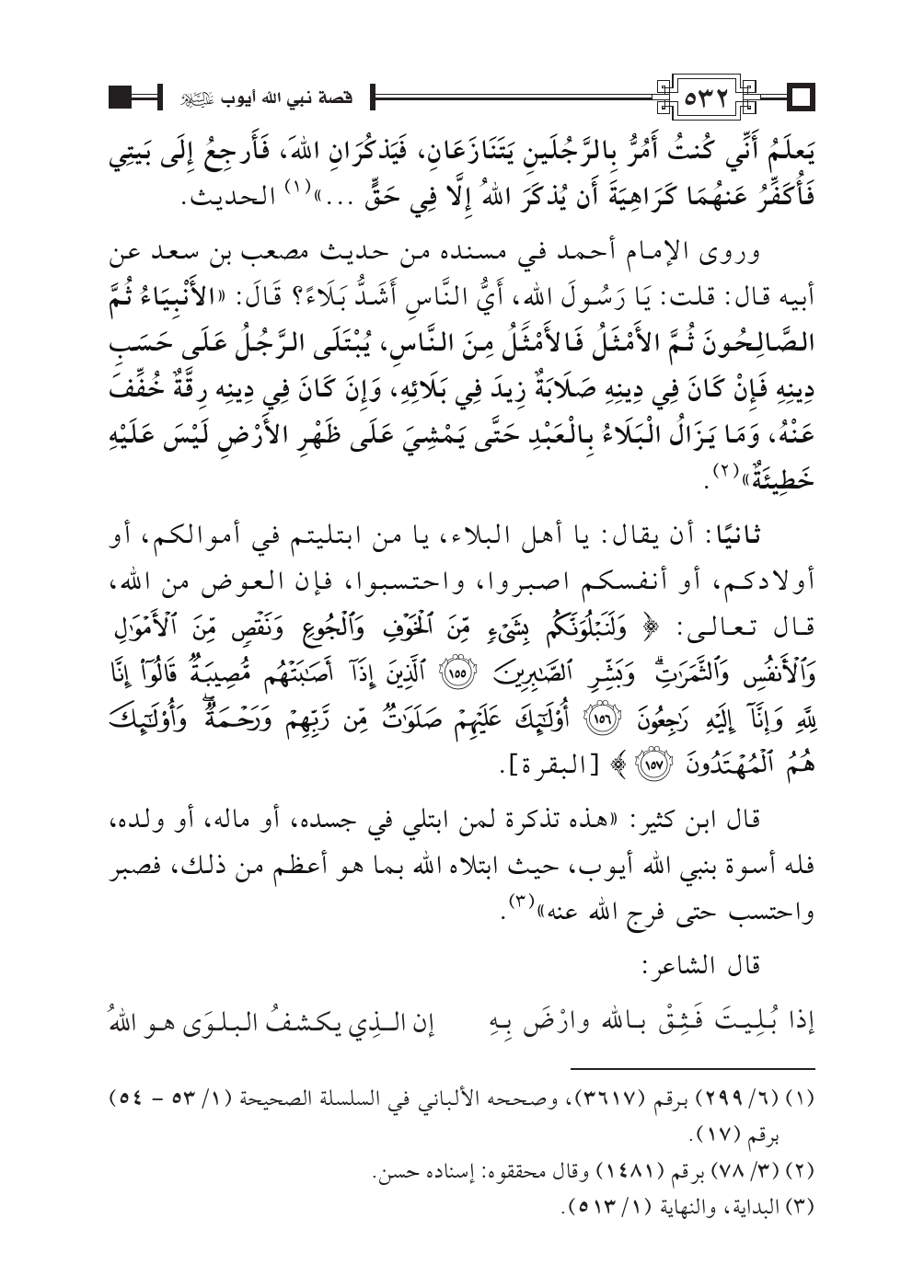 قال ابن كثير: «هذه تذكرة لمن ابتلي في جسده، أو ماله، أو ولده، فله أسوة بنبي الله أيوب، حيث ابتلاه الله بما هو أعظم من ذلك، فصبر واحتسب حتى فرج الله عنه» (¬٣).