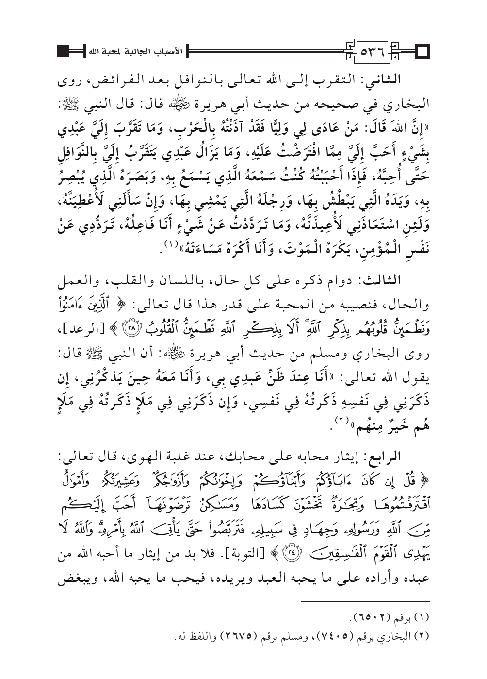 الثاني: التقرب إلى الله تعالى بالنوافل بعد الفرائض، روى البخاري في صحيحه من حديث أبي هريرة - رضي الله عنه - قال: قال النبي - صلى الله عليه وسلم -: «إِنَّ اللهَ قَالَ: مَنْ عَادَى لِي وَلِيًّا فَقَدْ آذَنْتُهُ بِالْحَرْبِ، وَمَا تَقَرَّبَ إِلَيَّ عَبْدِي بِشَيْءٍ أَحَبَّ إِلَيَّ مِمَّا افْتَرَضْتُ عَلَيْهِ، وَمَا يَزَالُ عَبْدِي يَتَقَرَّبُ إِلَيَّ بِالنَّوَافِلِ حَتَّى أُحِبَّهُ، فَإِذَا أَحْبَبْتُهُ كُنْتُ سَمْعَهُ الَّذِي يَسْمَعُ بِهِ، وَبَصَرَهُ الَّذِي يُبْصِرُ بِهِ، وَيَدَهُ الَّتِي يَبْطُشُ بِهَا، وَرِجْلَهُ الَّتِي يَمْشِي بِهَا، وَإِنْ سَأَلَنِي لَأُعْطِيَنَّهُ، وَلَئِنِ اسْتَعَاذَنِي لَأُعِيذَنَّهُ، وَمَا تَرَدَّدْتُ عَنْ شَيْءٍ أَنَا فَاعِلُهُ، تَرَدُّدِي عَنْ نَفْسِ الْمُؤْمِنِ، يَكْرَهُ الْمَوْتَ، وَأَنَا أَكْرَهُ مَسَاءَتَهُ» (¬١).