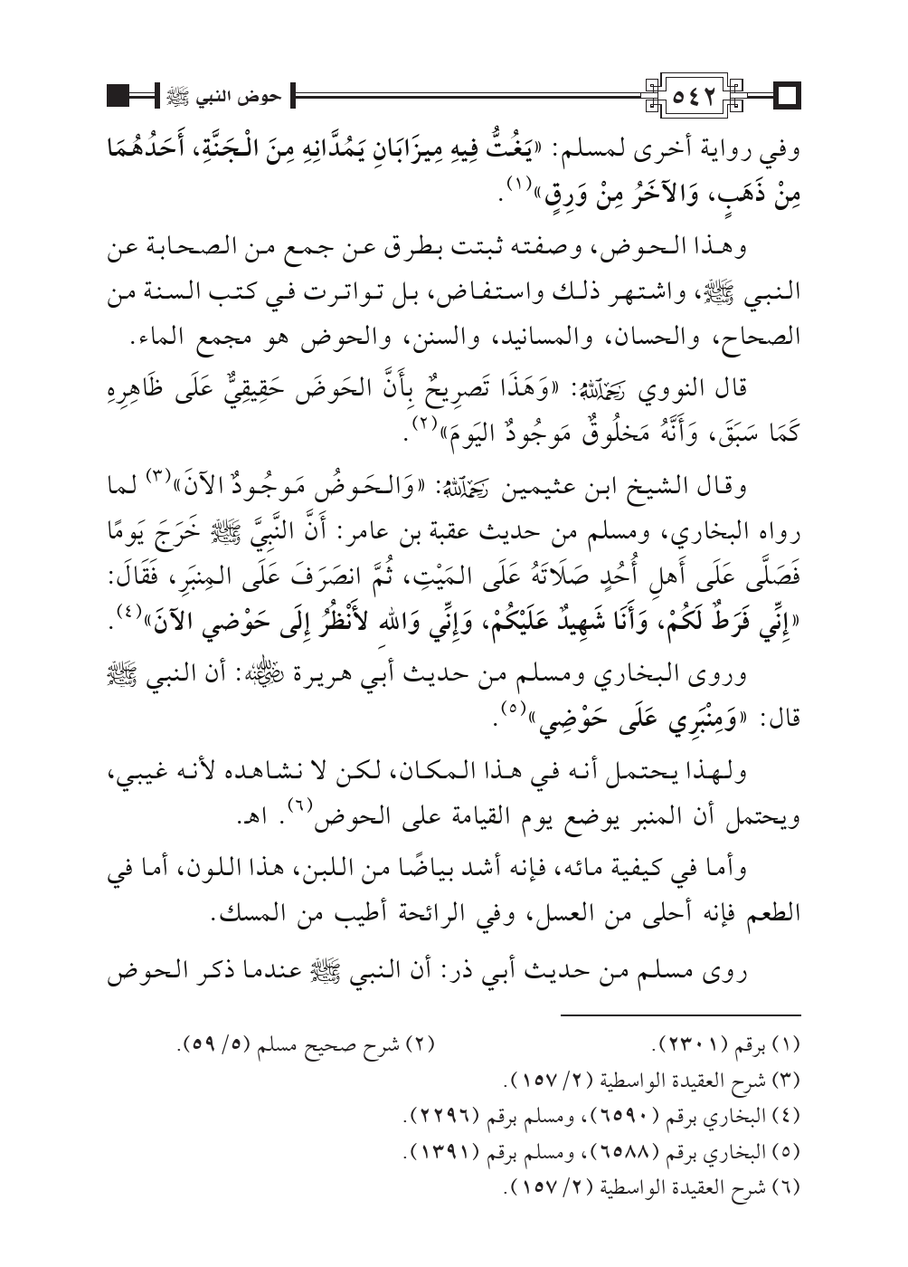 وقال الشيخ ابن عثيمين رحمه الله: «وَالحَوضُ مَوجُودٌ الآنَ» (¬٣) لما رواه البخاري، ومسلم من حديث عقبة بن عامر: أَنَّ النَّبِيَّ - صلى الله عليه وسلم - خَرَجَ يَومًا فَصَلَّى عَلَى أَهلِ أُحُدٍ صَلَاتَهُ عَلَى المَيْتِ، ثُمَّ انصَرَفَ عَلَى المِنبَرِ، فَقَالَ: «إِنِّي فَرَطٌ لَكُمْ، وَأَنَا شَهِيدٌ عَلَيْكُمْ، وَإِنِّي وَاللهِ لأَنْظُرُ إِلَى حَوْضي الآنَ» (¬٤).