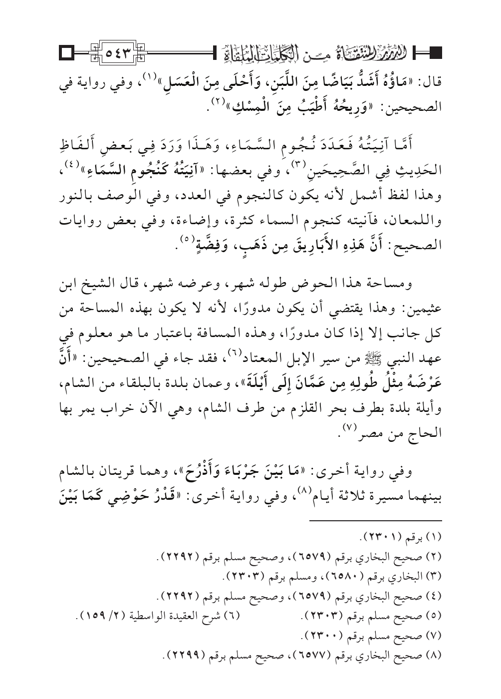 ومساحة هذا الحوض طوله شهر، وعرضه شهر، قال الشيخ ابن عثيمين: وهذا يقتضي أن يكون مدورًا، لأنه لا يكون بهذه المساحة من كل جانب إلا إذا كان مدورًا، وهذه المسافة باعتبار ما هو معلوم في عهد النبي - صلى الله عليه وسلم - من سير الإبل المعتاد (¬٦)، فقد جاء في الصحيحين: «أَنَّ عَرْضَهُ مِثْلُ طُولِهِ مِن عَمَّانَ إِلَى أَيْلَةَ»، وعمان بلدة بالبلقاء من الشام، وأيلة بلدة بطرف بحر القلزم من طرف الشام، وهي الآن خراب يمر بها الحاج من مصر (¬٧).