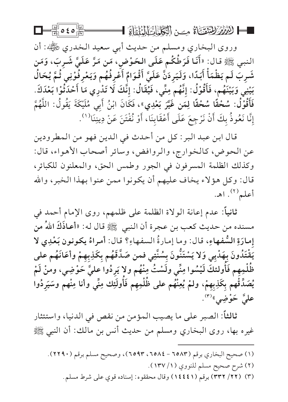 وروى البخاري ومسلم من حديث أبي سعيد الخدري - رضي الله عنه -: أن النبي - صلى الله عليه وسلم - قال: «أَنَا فَرَطُكُم عَلَى الحَوْضِ، مَن مَرَّ عَلَيَّ شَرِبَ، وَمَن شَرِبَ لَم يَظْمَا أَبَدًا، وَلَيَرِدَنَّ عَلَيَّ أَقْوَامٌ أَعْرِفُهُم وَيَعْرِفُوْنِي ثُمَّ يُحَالُ بَيْنِي وَبَيْنَهُم، فَأَقُوْلُ: إِنَّهُم مِنِّي، فَيُقَالُ: إِنَّكَ لَا تَدْرِي مَا أَحْدَثُوْا بَعْدَكَ. فَأَقُوْلُ: سُحْقًا سُحْقًا لِمَن غَيَّرَ بَعْدِي»، فَكَانَ ابْنُ أَبِي مُلَيْكَةَ يَقُولُ: اللَّهُمَّ إِنَّا نَعُوذُ بِكَ أَنْ نَرْجِعَ عَلَى أَعْقَابِنَا، أَوْ نُفْتَنَ عَنْ دِينِنَا (¬١).