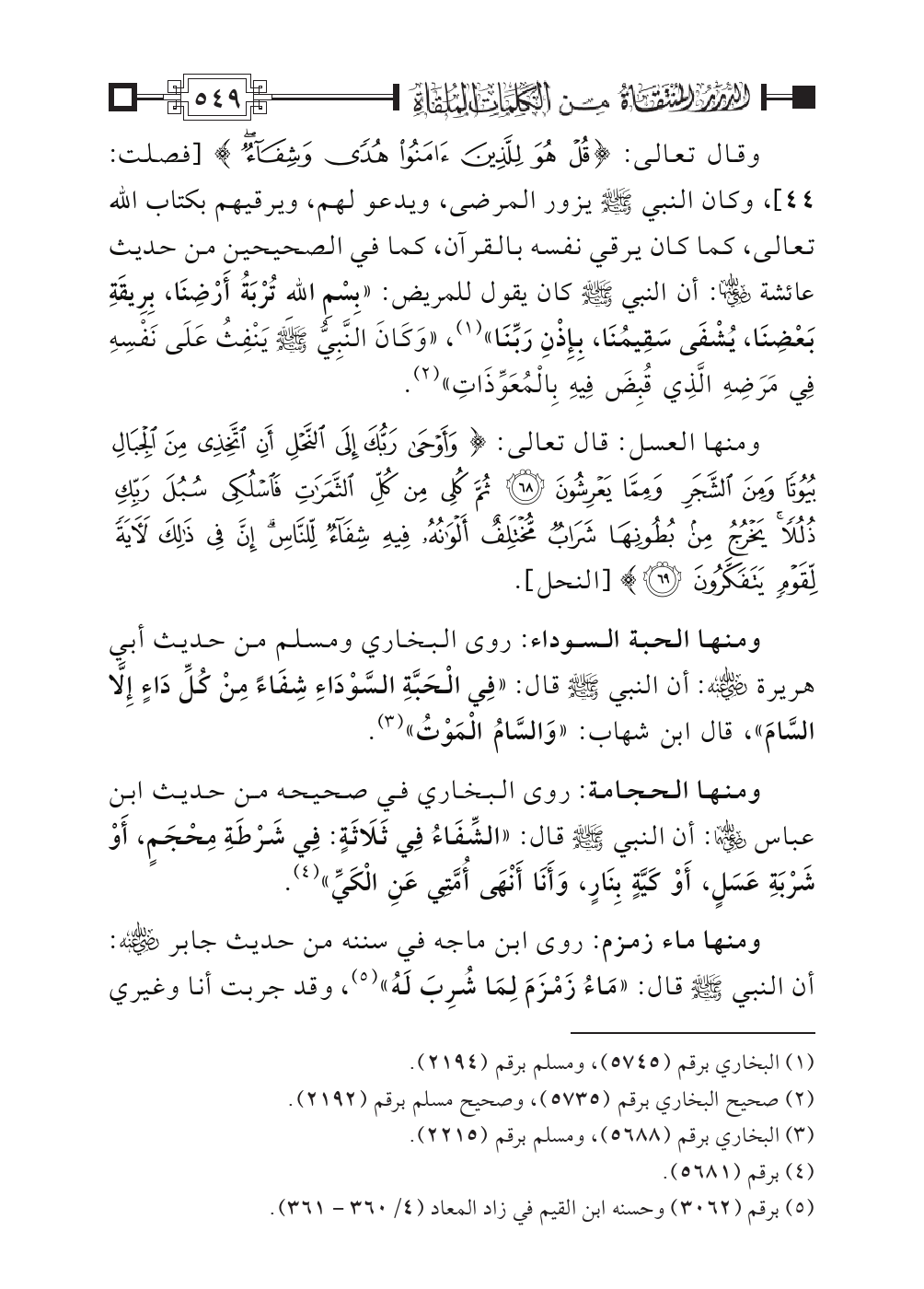 وقال تعالى: {قُلْ هُوَ لِلَّذِينَ آَمَنُوا هُدًى وَشِفَاءٌ} [فصلت: ٤٤]، وكان النبي - صلى الله عليه وسلم - يزور المرضى، ويدعو لهم، ويرقيهم بكتاب الله تعالى، كما كان يرقي نفسه بالقرآن، كما في الصحيحين من حديث عائشة رضي الله عنهما: أن النبي - صلى الله عليه وسلم - كان يقول للمريض: «بِسْمِ اللهِ تُرْبَةُ أَرْضِنَا، بِرِيقَةِ بَعْضِنَا، يُشْفَى سَقِيمُنَا، بِإِذْنِ رَبِّنَا» (¬١)، «وَكَانَ النَّبِيُّ - صلى الله عليه وسلم - يَنْفِثُ عَلَى نَفْسِهِ فِي مَرَضِهِ الَّذِي قُبِضَ فِيهِ بِالْمُعَوِّذَاتِ» (¬٢).