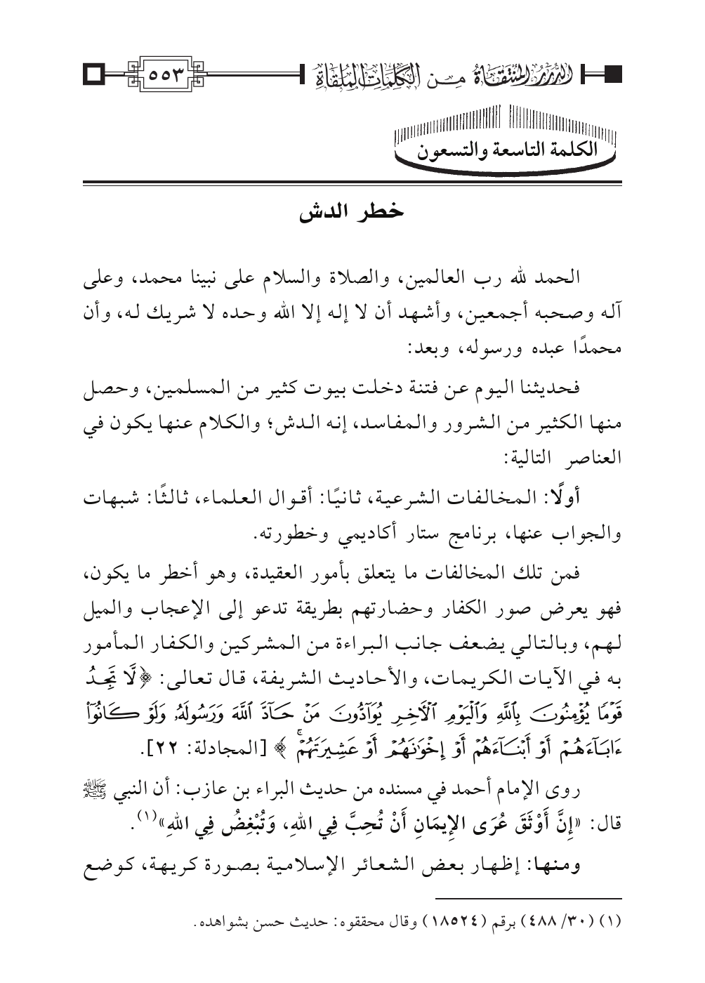 روى الإمام أحمد في مسنده من حديث البراء بن عازب: أن النبي - صلى الله عليه وسلم - قال: «إِنَّ أَوْثَقَ عُرَى الإِيمَانِ أَنْ تُحِبَّ فِي اللهِ، وَتُبْغِضُ فِي اللهِ» (¬١).
