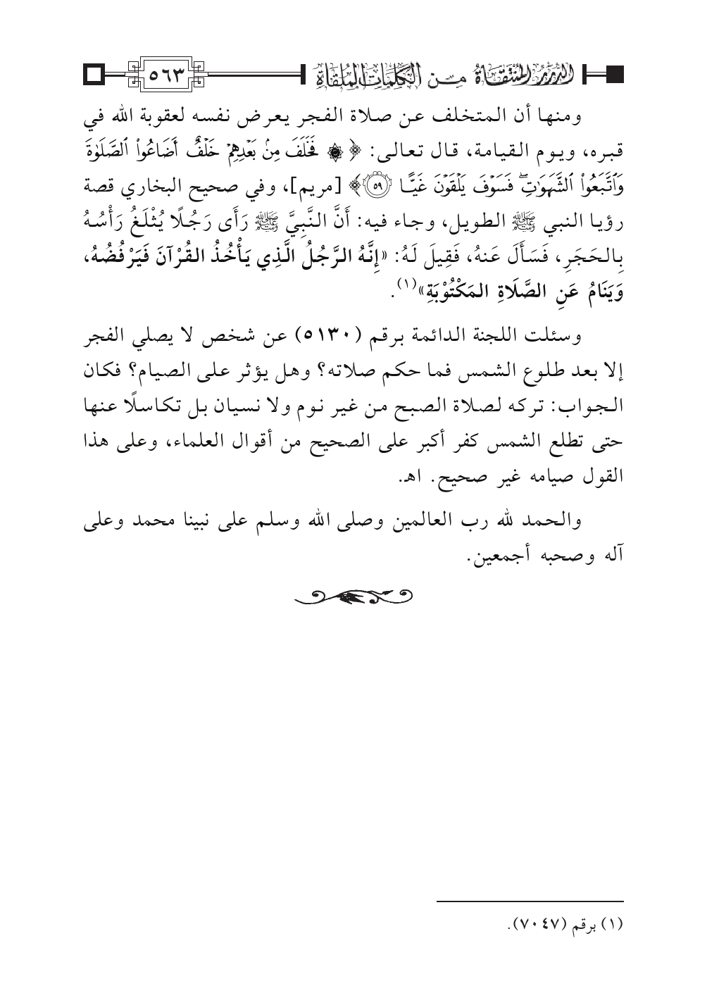 ومنها أن المتخلف عن صلاة الفجر يعرض نفسه لعقوبة الله في قبره، ويوم القيامة، قال تعالى: {فَخَلَفَ مِنْ بَعْدِهِمْ خَلْفٌ أَضَاعُوا الصَّلَاةَ وَاتَّبَعُوا الشَّهَوَاتِ فَسَوْفَ يَلْقَوْنَ غَيًّا} [مريم: ٥٩]، وفي صحيح البخاري قصة رؤيا النبي - صلى الله عليه وسلم - الطويل، وجاء فيه: أَنَّ النَّبِيَّ - صلى الله عليه وسلم - رَأَى رَجُلاً يُثْلَغُ رَاسُهُ بِالحَجَرِ، فَسَأَلَ عَنهُ، فَقِيلَ لَهُ: «إِنَّهُ الرَّجُلُ الَّذِي يَاخُذُ القُرْآنَ فَيَرْفُضُهُ، وَيَنَامُ عَنِ الصَّلَاةِ المَكْتُوْبَةِ» (¬١).