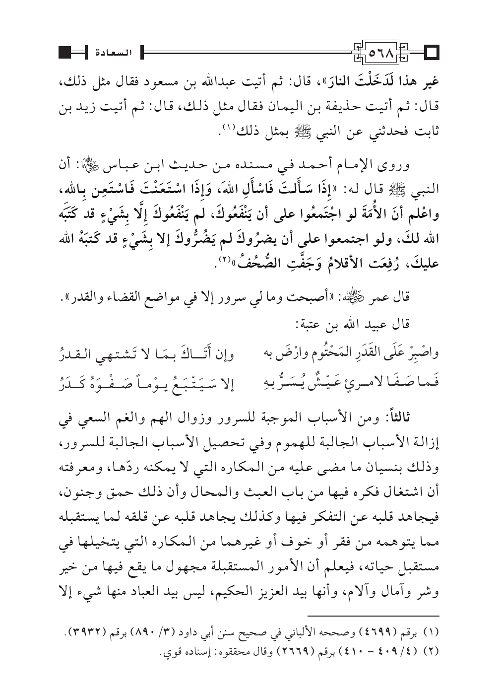وروى الإمام أحمد في مسنده من حديث ابن عباس رضي الله عنهما: أن النبي - صلى الله عليه وسلم - قال له: «إِذَا سَأَلتَ فَاسْأَلِ اللهَ، وَإِذَا اسْتَعَنْتَ فَاسْتَعِن بِاللهِ، واعْلم أنَ الأُمَةَ لو اجْتَمعُوا على أن يَنْفَعُوكَ، لم يَنْفَعُوكَ إِلَاّ بِشَيْءٍ قد كَتَبَه الله لكَ، ولو اجتمعوا على أن يضرُوكَ لم يَضُرُّوكَ إلا بِشَيْءٍ قد كَتبَهُ الله عليكَ، رُفِعَت الأقلامُ وَجَفَّتِ الصُّحُفُ» (¬٢).