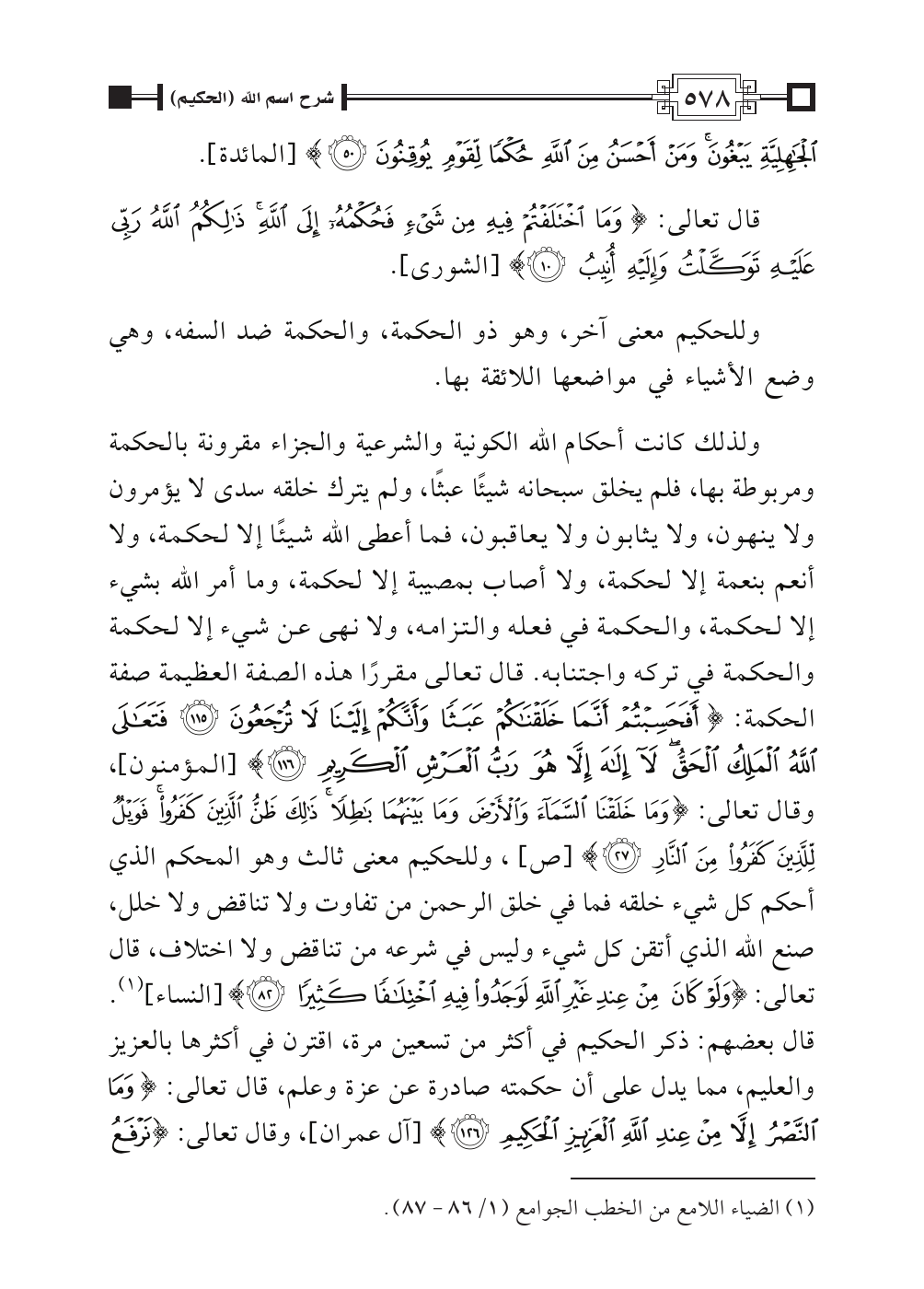 ولذلك كانت أحكام الله الكونية والشرعية والجزاء مقرونة بالحكمة ومربوطة بها، فلم يخلق سبحانه شيئًا عبثًا، ولم يترك خلقه سدى لا يؤمرون ولا ينهون، ولا يثابون ولا يعاقبون، فما أعطى الله شيئًا إلا لحكمة، ولا أنعم بنعمة إلا لحكمة، ولا أصاب بمصيبة إلا لحكمة، وما أمر الله بشيء إلا لحكمة، والحكمة في فعله والتزامه، ولا نهى عن شيء إلا لحكمة والحكمة في تركه واجتنابه. قال تعالى مقررًا هذه الصفة العظيمة صفة الحكمة: {أَفَحَسِبْتُمْ أَنَّمَا خَلَقْنَاكُمْ عَبَثًا وَأَنَّكُمْ إِلَيْنَا لَا تُرْجَعُونَ * فَتَعَالَى اللهُ المَلِكُ الحَقُّ لَا إِلَهَ إِلَاّ هُوَ رَبُّ العَرْشِ الكَرِيمِ} [المؤمنون: ١١٥ - ١١٦]، وقال تعالى: {وَمَا خَلَقْنَا السَّمَاءَ وَالأَرْضَ وَمَا بَيْنَهُمَا بَاطِلاً ذَلِكَ ظَنُّ الَّذِينَ كَفَرُوا فَوَيْلٌ لِلَّذِينَ كَفَرُوا مِنَ النَّارِ} [ص: ٢٧]، وللحكيم معنى ثالث وهو المحكم الذي أحكم كل شيء خلقه فما في خلق الرحمن من تفاوت ولا تناقض ولا خلل، صنع الله الذي أتقن كل شيء وليس في شرعه من تناقض ولا اختلاف، قال تعالى: {وَلَوْ كَانَ مِنْ عِنْدِ غَيْرِ اللهِ لَوَجَدُوا فِيهِ اخْتِلَافًا كَثِيرًا} [النساء: ٨٢] (¬١). قال بعضهم: ذكر الحكيم في أكثر من تسعين مرة، اقترن في أكثرها بالعزيز والعليم، مما يدل على أن حكمته صادرة عن عزة وعلم، قال تعالى: {وَمَا النَّصْرُ إِلَاّ مِنْ عِنْدِ اللهِ العَزِيزِ الحَكِيم} [آل عمران: ١٢٦]، وقال تعالى: {نَرْفَعُ