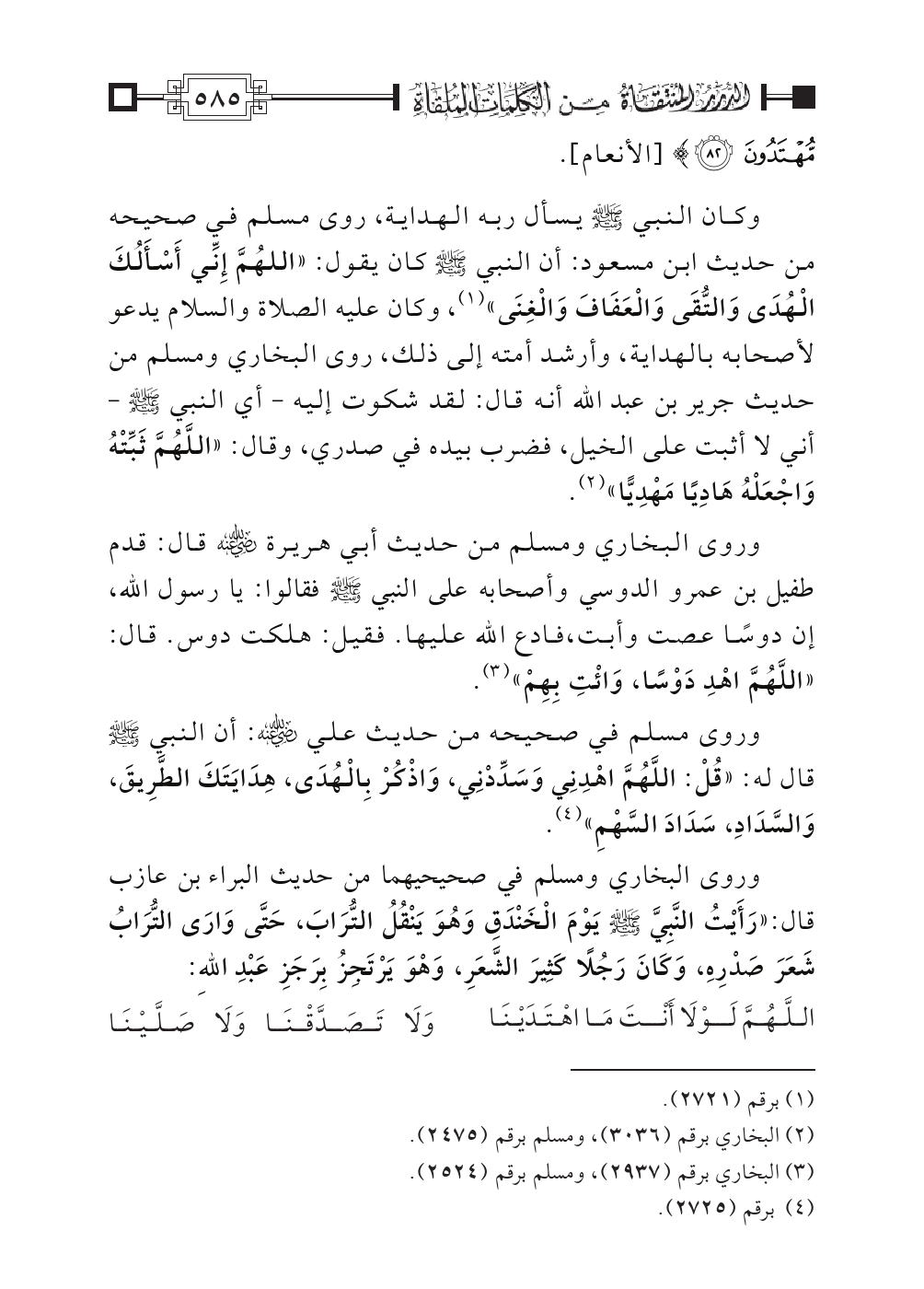وكان النبي - صلى الله عليه وسلم - يسأل ربه الهداية، روى مسلم في صحيحه من حديث ابن مسعود: أن النبي - صلى الله عليه وسلم - كان يقول: «اللهُمَّ إِنِّي أَسْأَلُكَ الْهُدَى وَالتُّقَى وَالْعَفَافَ وَالْغِنَى» (¬١)، وكان عليه الصلاة والسلام يدعو لأصحابه بالهداية، وأرشد أمته إلى ذلك، روى البخاري ومسلم من حديث جرير بن عبد الله أنه قال: لقد شكوت إليه - أي النبي - صلى الله عليه وسلم - أني لا أثبت على الخيل، فضرب بيده في صدري، وقال: «اللَّهُمَّ ثَبِّتْهُ وَاجْعَلْهُ هَادِيًا مَهْدِيًّا» (¬٢).