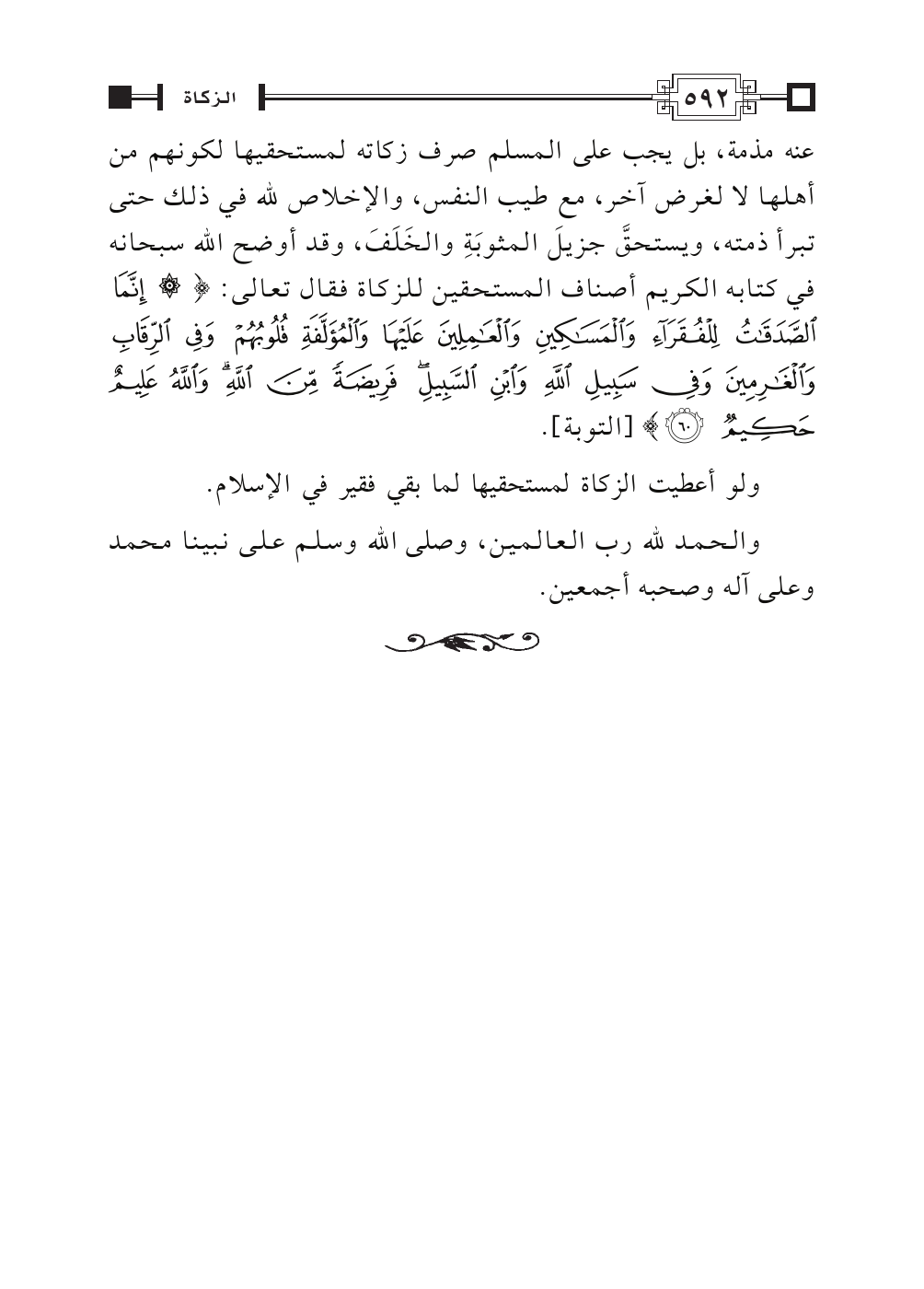عنه مذمة، بل يجب على المسلم صرف زكاته لمستحقيها لكونهم من أهلها لا لغرض آخر، مع طيب النفس، والإخلاص لله في ذلك حتى تبرأ ذمته، ويستحقَّ جزيلَ المثوبَةِ والخَلَفَ، وقد أوضح الله سبحانه في كتابه الكريم أصناف المستحقين للزكاة فقال تعالى: {إِنَّمَا الصَّدَقَاتُ لِلْفُقَرَاءِ وَالمَسَاكِينِ وَالعَامِلِينَ عَلَيْهَا وَالمُؤَلَّفَةِ قُلُوبُهُمْ وَفِي الرِّقَابِ وَالغَارِمِينَ وَفِي سَبِيلِ اللهِ وَاِبْنِ السَّبِيلِ فَرِيضَةً مِنَ اللهِ وَاللهُ عَلِيمٌ حَكِيمٌ} [التوبة: ٦٠].