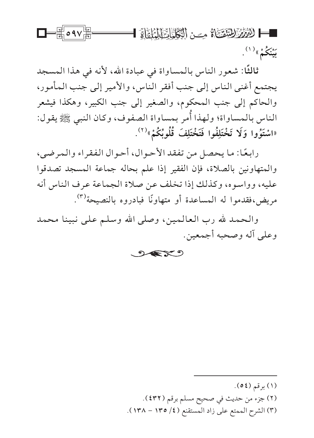 ثالثًا: شعور الناس بالمساواة في عبادة الله، لأنه في هذا المسجد يجتمع أغنى الناس إلى جنب أفقر الناس، والأمير إلى جنب المأمور، والحاكم إلى جنب المحكوم، والصغير إلى جنب الكبير، وهكذا فيشعر الناس بالمساواة؛ ولهذا أُمر بمساواة الصفوف، وكان النبي - صلى الله عليه وسلم - يقول: «اسْتَوُوا وَلَا تَخْتَلِفُوا فَتَخْتَلِفَ قُلُوبُكُمْ» (¬٢).
