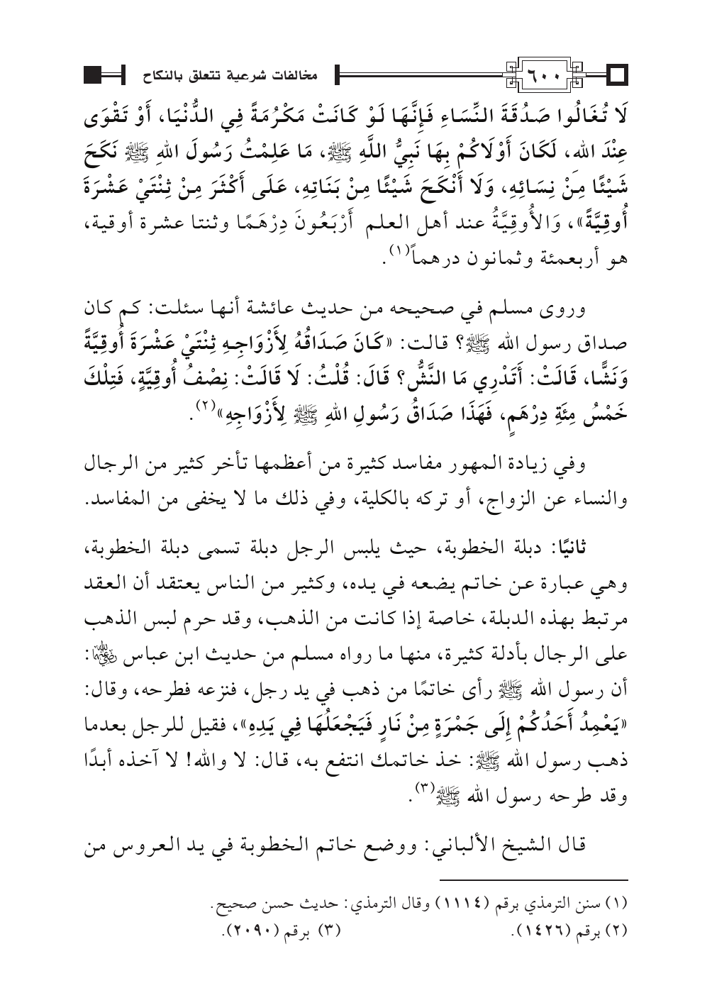 لَا تُغَالُوا صَدُقَةَ النِّسَاءِ فَإِنَّهَا لَوْ كَانَتْ مَكْرُمَةً فِي الدُّنْيَا، أَوْ تَقْوَى عِنْدَ اللهِ، لَكَانَ أَوْلَاكُمْ بِهَا نَبِيُّ اللَّهِ - صلى الله عليه وسلم -، مَا عَلِمْتُ رَسُولَ اللهِ - صلى الله عليه وسلم - نَكَحَ شَيْئًا مِنْ نِسَائِهِ، وَلَا أَنْكَحَ شَيْئًا مِنْ بَنَاتِهِ، عَلَى أَكْثَرَ مِنْ ثِنْتَيْ عَشْرَةَ أُوقِيَّةً»، وَالأُوقِيَّةُ عند أهل العلم أَرْبَعُونَ دِرْهَمًا وثنتا عشرة أوقية، هو أربعمئة وثمانون درهماً (¬١).