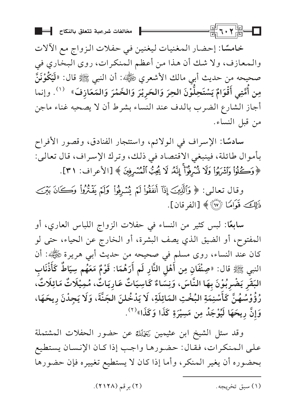 سابعًا: لبس كثير من النساء في حفلات الزواج اللباس العاري، أو المفتوح، أو الضيق الذي يصف البشرة، أو الخارج عن الحياء، حتى لو كان عند النساء، روى مسلم في صحيحه من حديث أبي هريرة - رضي الله عنه -: أن النبي - صلى الله عليه وسلم - قال: «صِنْفَانِ مِن أَهْلِ النَّارِ لَم أَرَهُمَا: قَوْمٌ مَعَهُم سِيَاطٌ كَأَذْنَابِ البَقَرِ يَضْرِبُوْنَ بِهَا النَّاسَ، وَنِسَاءٌ كَاسِيَاتٌ عَارِيَاتٌ، مُمِيْلَاتٌ مَائِلَاتٌ، رُؤُوْسُهُنَّ كَأَسْنِمَةِ البُخْتِ المَائِلَةِ، لَا يَدْخُلنَ الجَنَّةَ، وَلَا يَجِدْنَ رِيحَهَا، وَإِنَّ رِيحَهَا لَيُوْجَدُ مِن مَسِيْرَةِ كَذَا وَكَذَا» (¬٢).