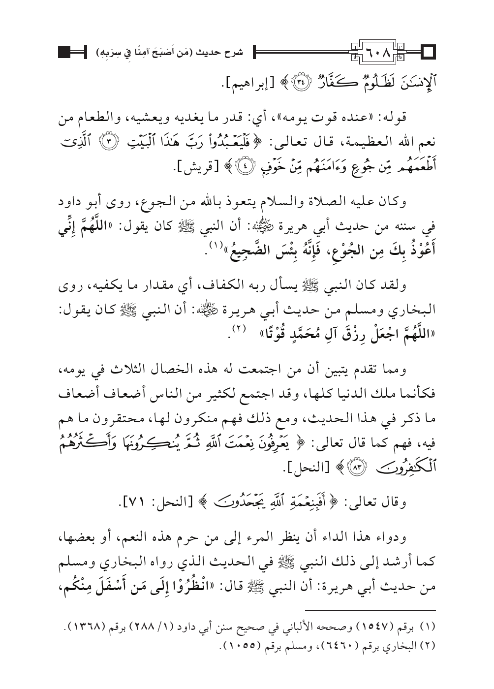 ومما تقدم يتبين أن من اجتمعت له هذه الخصال الثلاث في يومه، فكأنما ملك الدنيا كلها، وقد اجتمع لكثير من الناس أضعاف أضعاف ما ذكر في هذا الحديث، ومع ذلك فهم منكرون لها، محتقرون ما هم فيه، فهم كما قال تعالى: {يَعْرِفُونَ نِعْمَةَ اللهِ ثُمَّ يُنْكِرُونَهَا وَأَكْثَرُهُمُ الكَافِرُونَ} [النحل: ٨٣].
