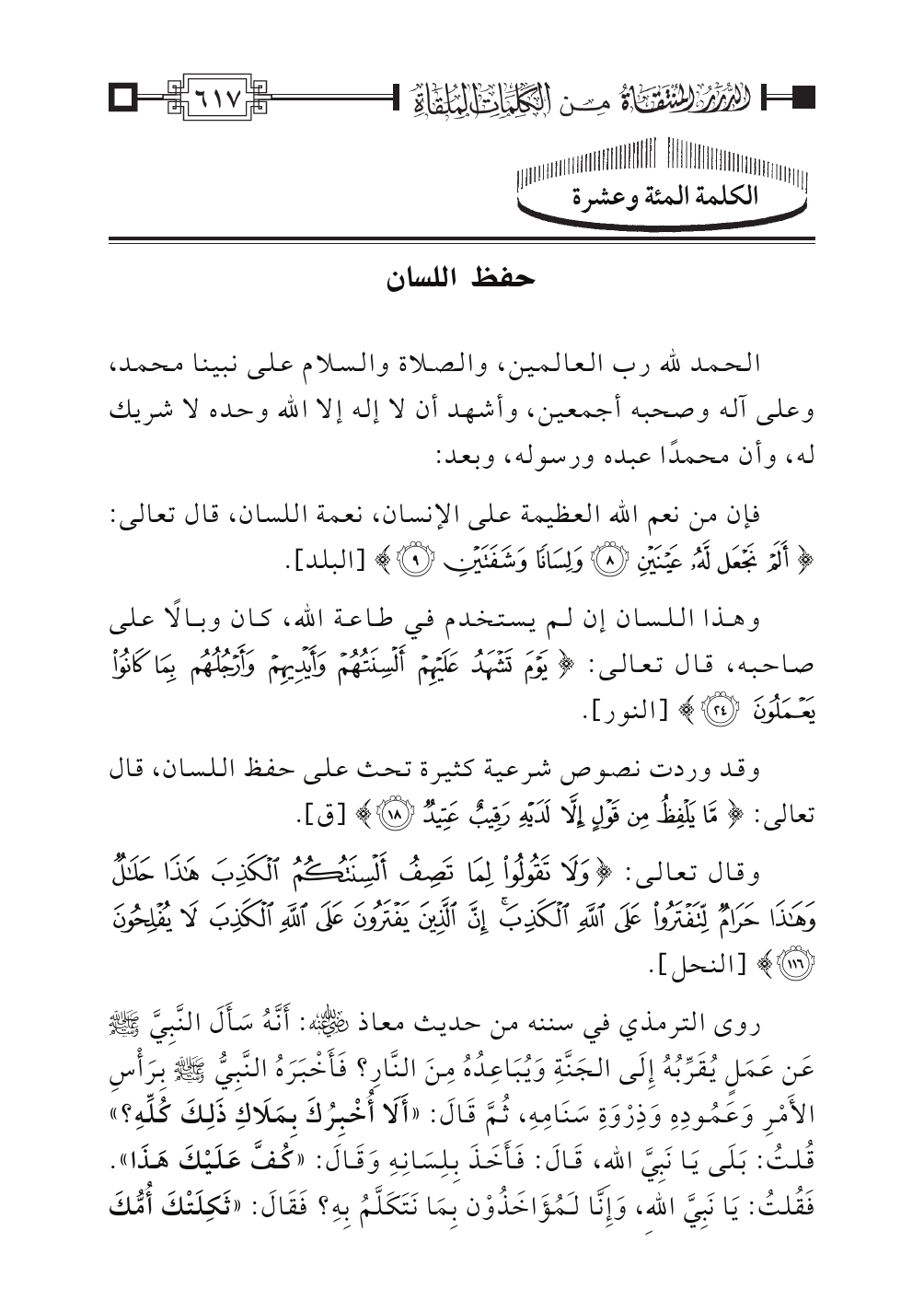 روى الترمذي في سننه من حديث معاذ - رضي الله عنه -: أَنَّهُ سَأَلَ النَّبِيَّ - صلى الله عليه وسلم - عَن عَمَلٍ يُقَرِّبُهُ إِلَى الجَنَّةِ وَيُبَاعِدُهُ مِنَ النَّارِ؟ فَأَخْبَرَهُ النَّبِيُّ - صلى الله عليه وسلم - بِرَاسِ الأَمْرِ وَعَمُودِهِ وَذِرْوَةِ سَنَامِهِ، ثُمَّ قَالَ: «أَلَا أُخْبِرُكَ بِمَلَاكِ ذَلِكَ كُلِّهِ؟ » قُلتُ: بَلَى يَا نَبِيَّ اللهِ، قَالَ: فَأَخَذَ بِلِسَانِهِ وَقَالَ: «كُفَّ عَلَيْكَ هَذَا». فَقُلتُ: يَا نَبِيَّ اللهِ، وَإِنَّا لَمُؤَاخَذُوْن بِمَا نَتَكَلَّمُ بِهِ؟ فَقَالَ: «ثَكِلَتْكَ أُمُّكَ