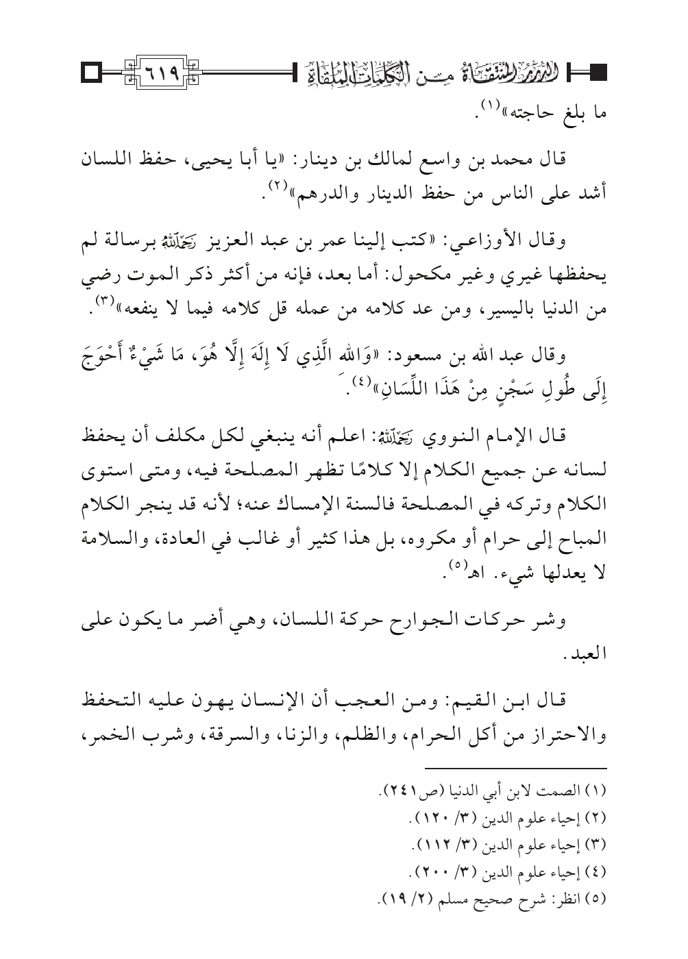 قال محمد بن واسع لمالك بن دينار: «يا أبا يحيى، حفظ اللسان أشد على الناس من حفظ الدينار والدرهم» (¬٢).