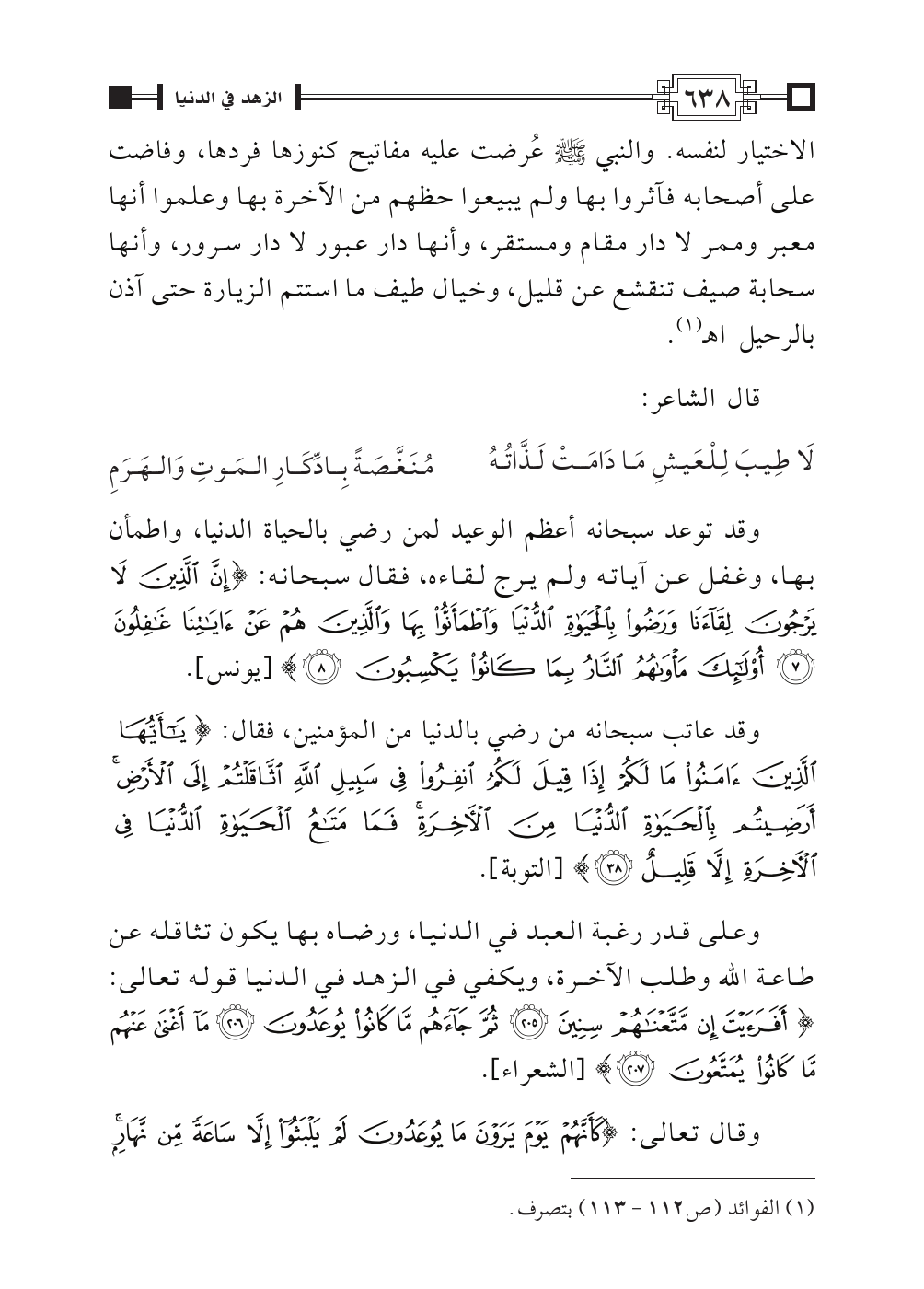 الاختيار لنفسه. والنبي - صلى الله عليه وسلم - عُرضت عليه مفاتيح كنوزها فردها، وفاضت على أصحابه فآثروا بها ولم يبيعوا حظهم من الآخرة بها وعلموا أنها معبر وممر لا دار مقام ومستقر، وأنها دار عبور لا دار سرور، وأنها سحابة صيف تنقشع عن قليل، وخيال طيف ما استتم الزيارة حتى آذن بالرحيل اهـ (¬١).