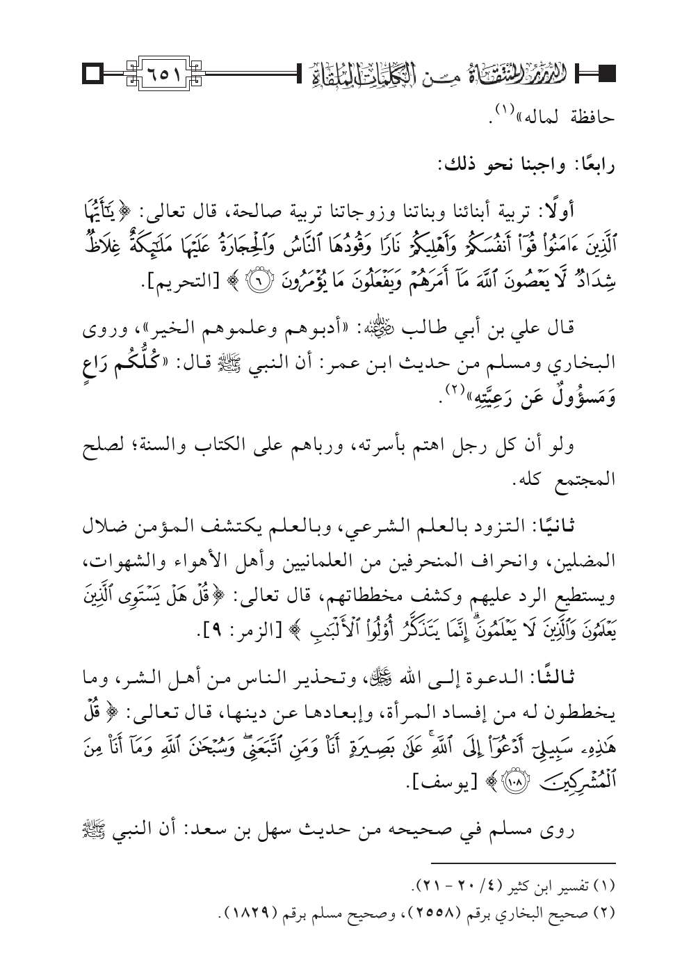 أولاً: تربية أبنائنا وبناتنا وزوجاتنا تربية صالحة، قال تعالى: {يَا أَيُّهَا الَّذِينَ آَمَنُوا قُوا أَنْفُسَكُمْ وَأَهْلِيكُمْ نَارًا وَقُودُهَا النَّاسُ وَالحِجَارَةُ عَلَيْهَا مَلائِكَةٌ غِلَاظٌ شِدَادٌ لَا يَعْصُونَ اللهَ مَا أَمَرَهُمْ وَيَفْعَلُونَ مَا يُؤْمَرُونَ} [التحريم: ٦].