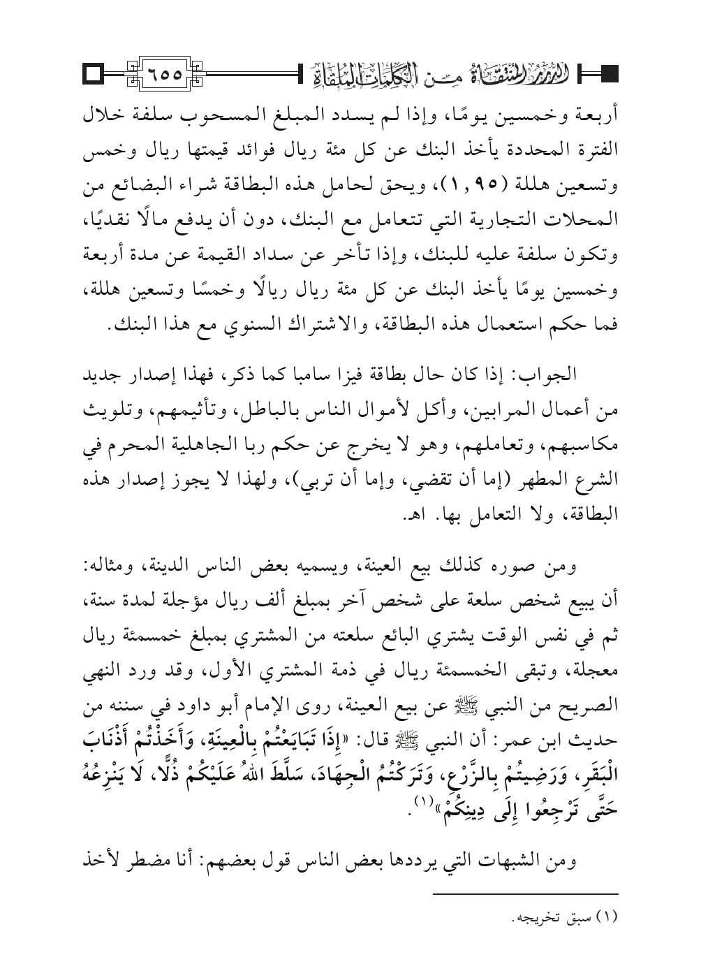 الجواب: إذا كان حال بطاقة فيزا سامبا كما ذكر، فهذا إصدار جديد من أعمال المرابين، وأكل لأموال الناس بالباطل، وتأثيمهم، وتلويث مكاسبهم، وتعاملهم، وهو لا يخرج عن حكم ربا الجاهلية المحرم في الشرع المطهر (إما أن تقضي، وإما أن تربي)، ولهذا لا يجوز إصدار هذه البطاقة، ولا التعامل بها. اهـ.