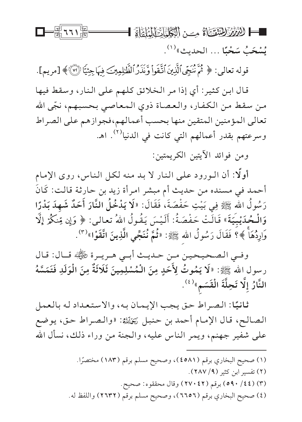 أولاً: أن الورود على النار لا بد منه لكل الناس، روى الإمام أحمد في مسنده من حديث أم مبشر امرأة زيد بن حارثة قالت: كَانَ رَسُولُ اللهِ - صلى الله عليه وسلم - فِي بَيْتِ حَفْصَةَ، فَقَالَ: «لَا يَدْخُلُ النَّارَ أَحَدٌ شَهِدَ بَدْرًا وَالْحُدَيْبِيَةَ» قَالَتْ حَفْصَةُ: أَلَيْسَ يَقُولُ اللهُ تعالى: {وَإِنْ مِنْكُمْ إِلَاّ وَارِدُهَا}؟ فَقَالَ رَسُولُ اللهِ - صلى الله عليه وسلم -: «ثُمَّ نُنَجِّي الَّذِينَ اتَّقَوْا» (¬٣).