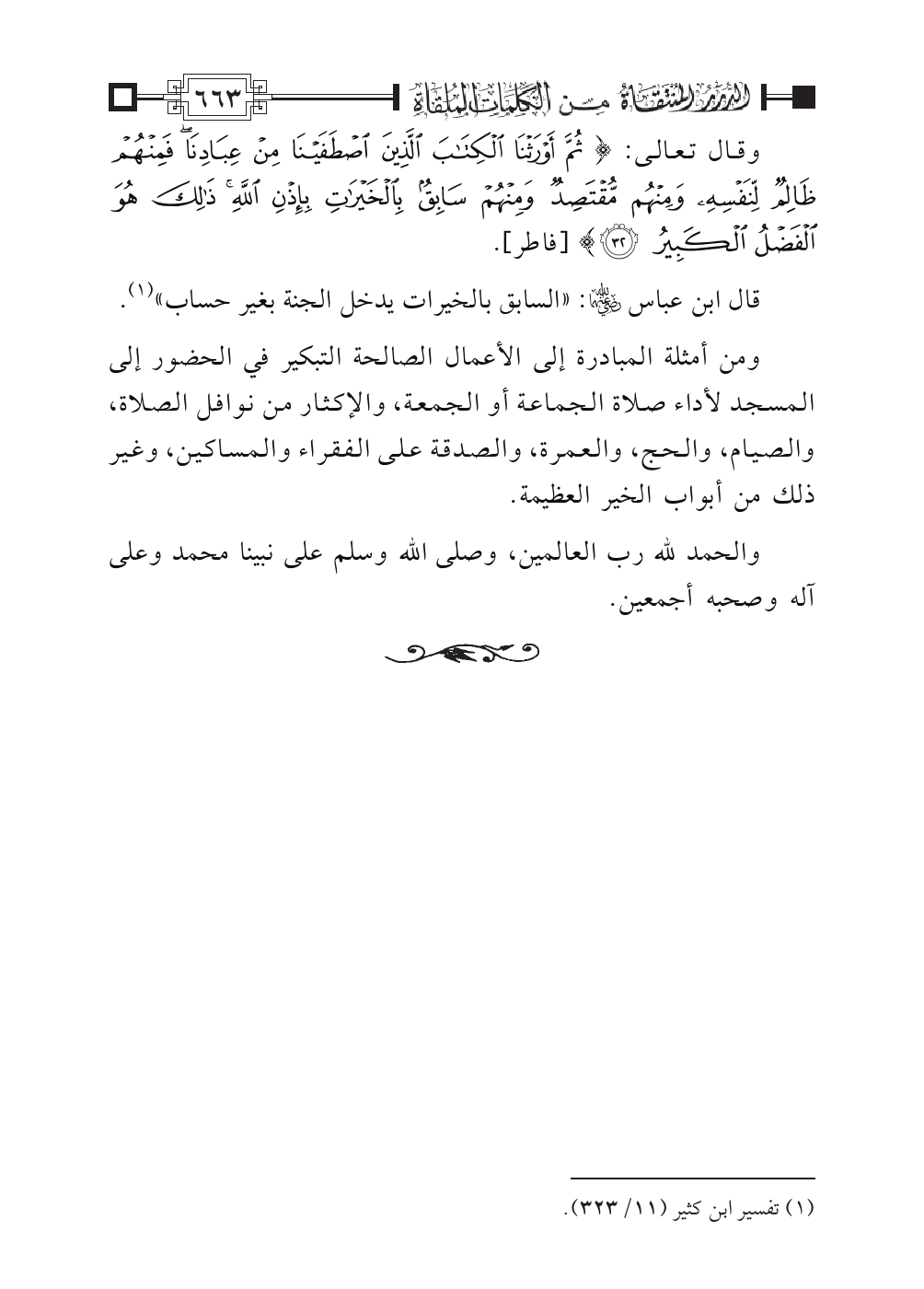 وقال تعالى: {ثُمَّ أَوْرَثْنَا الكِتَابَ الَّذِينَ اصْطَفَيْنَا مِنْ عِبَادِنَا فَمِنْهُمْ ظَالِمٌ لِنَفْسِهِ وَمِنْهُمْ مُقْتَصِدٌ وَمِنْهُمْ سَابِقٌ بِالخَيْرَاتِ بِإِذْنِ اللهِ ذَلِكَ هُوَ الفَضْلُ الكَبِيرُ} [فاطر: ٣٢].
